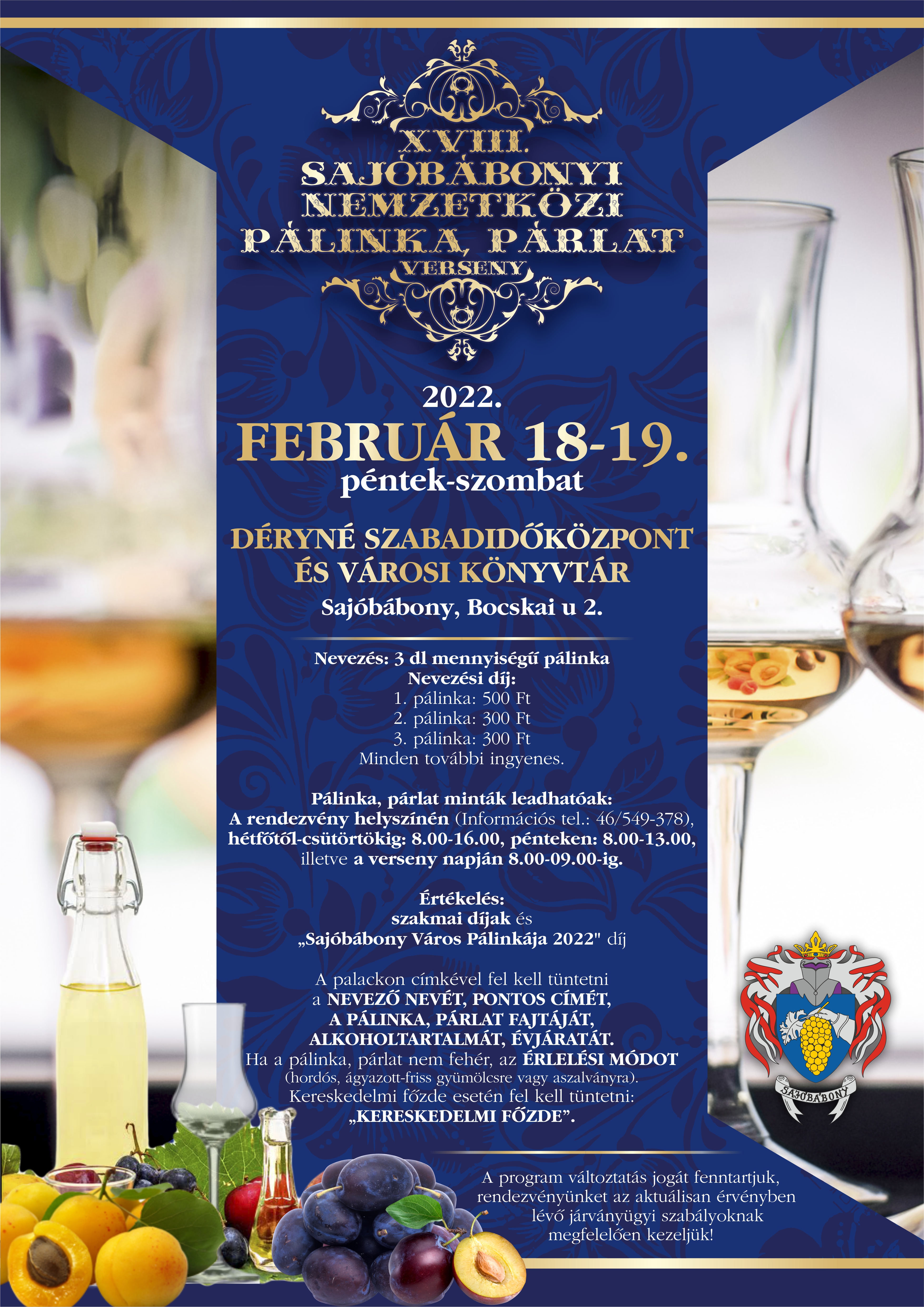 XVIII. alkalommal rendezzük meg Sajóbábonyban a pálinka, párlat versenyt, amelyre az Ön nevezését is várjuk! A verseny időpontja 2022. február 18-19., helyszíne a Déryné Szabadidőközpont és Városi Könyvtár. Bővebb információ az alábbi plakáton, illetve a rendezvénnyel kapcsolatosan érdeklődni lehet személyesen a Déryné Szabadidőközpontban ( Sajóbábony, Bocskai út 2.) és a 06-46/549-378 telefonszámon.