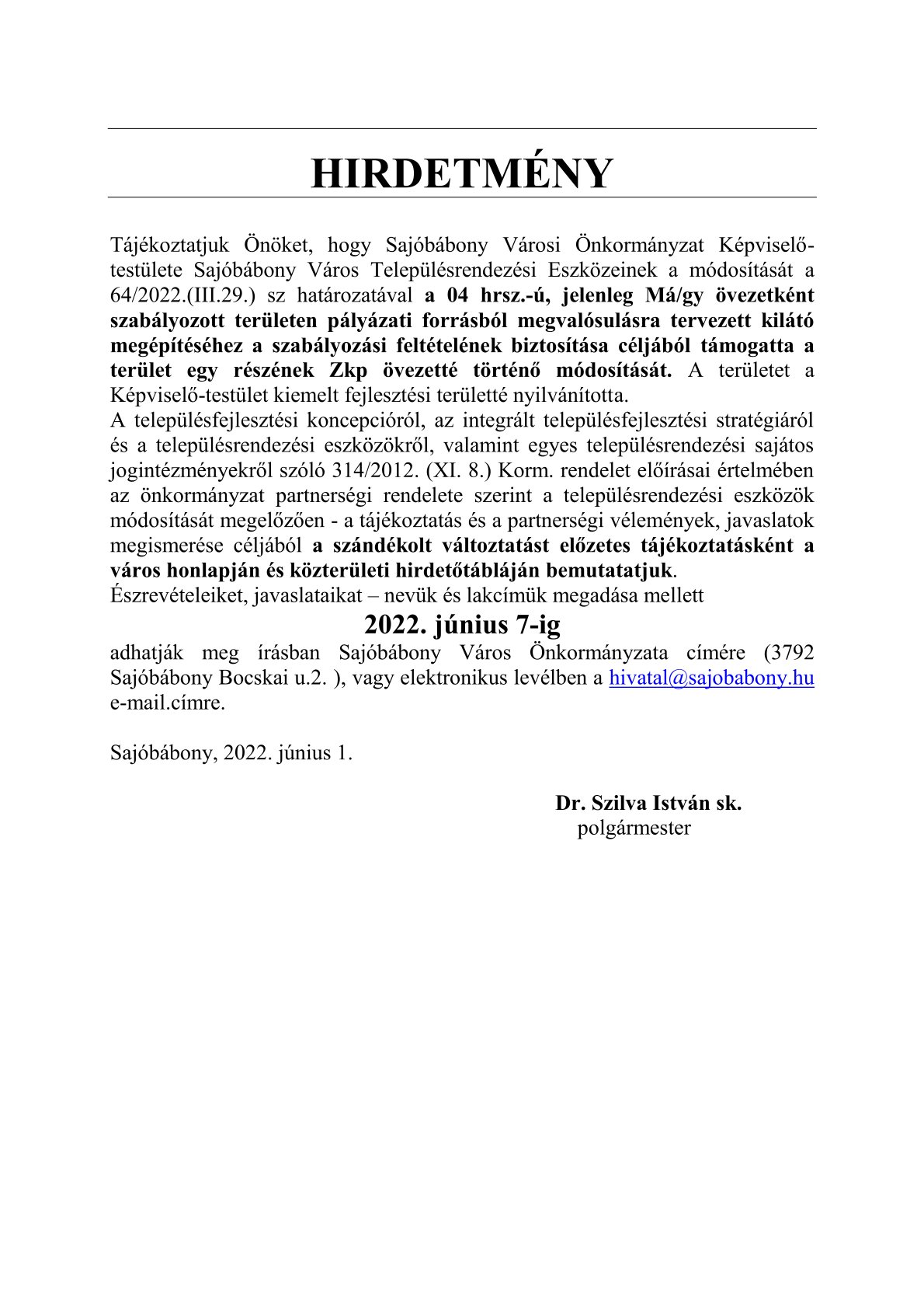 Hirdetmény- Tájékoztatjuk Önöket, hogy Sajóbábony Városi Önkormányzat Képviselő-testülete Sajóbábony Város Településrendezési Eszközeinek a módosítását a 64/2022.(III.29.) sz határozatával a 04 hrsz.-ú, jelenleg Má/gy övezetként szabályozott területen pályázati forrásból megvalósulásra tervezett kilátó megépítéséhez a szabályozási feltételének biztosítása céljából támogatta a terület egy részének Zkp övezetté történő módosítását. A területet a Képviselő-testület kiemelt fejlesztési területté nyilvánította. A településfejlesztési koncepcióról, az integrált településfejlesztési stratégiáról és a településrendezési eszközökről, valamint egyes településrendezési sajátos jogintézményekről szóló 314/2012. (XI. 8.) Korm. rendelet előírásai értelmében az önkormányzat partnerségi rendelete szerint a településrendezési eszközök módosítását megelőzően - a tájékoztatás és a partnerségi vélemények, javaslatok megismerése céljából a szándékolt változtatást előzetes tájékoztatásként a város honlapján és közterületi hirdetőtábláján bemutatatjuk. Észrevételeiket, javaslataikat – nevük és lakcímük megadása mellett 2022. június 7-ig adhatják meg írásban Sajóbábony Város Önkormányzata címére (3792 Sajóbábony Bocskai u.2. ), vagy elektronikus levélben a hivatal@sajobabony.hu e-mail.címre. Sajóbábony, 2022. június 1. Dr. Szilva István sk. polgármester