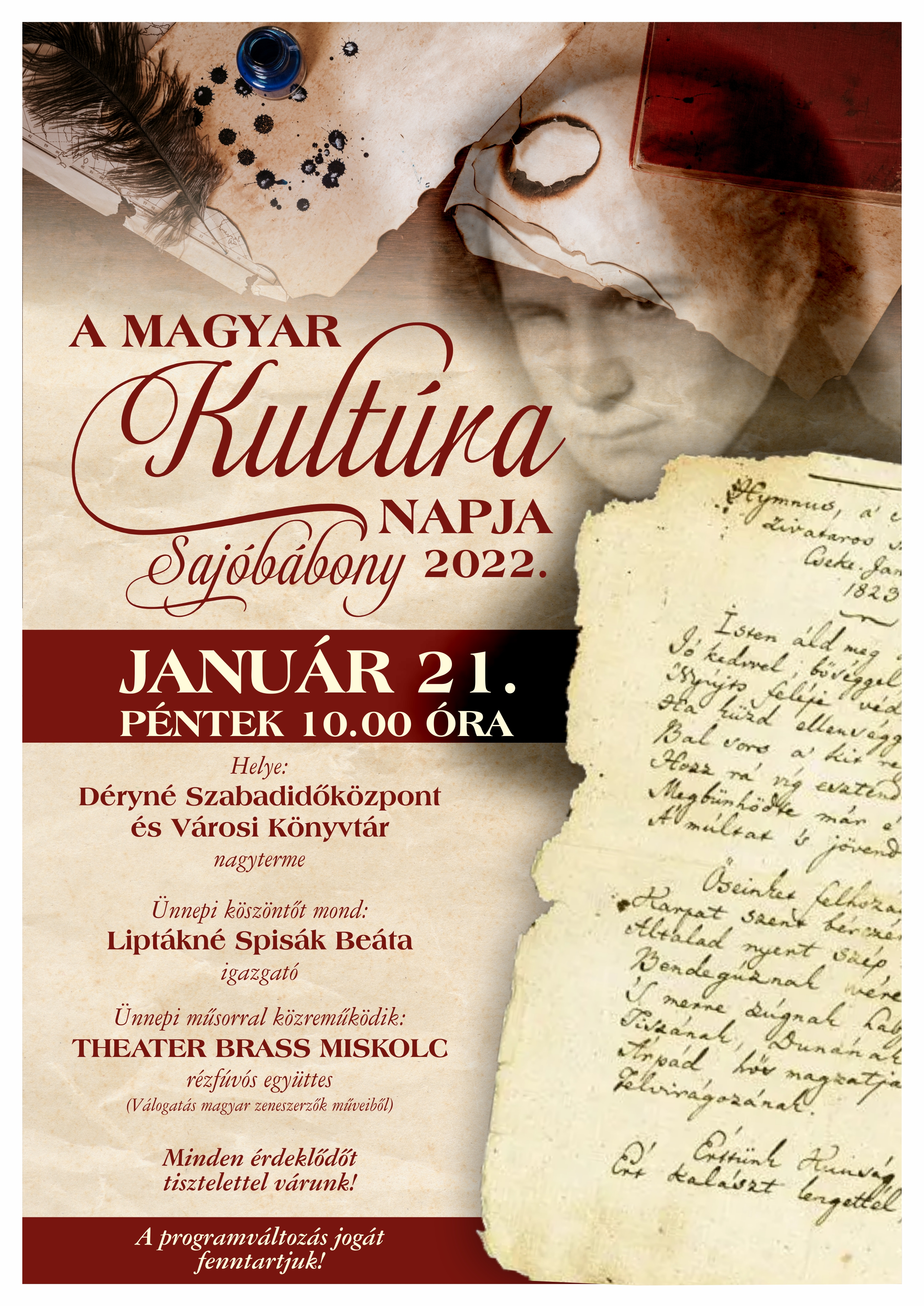 Posted inDSZKVK Lakossági A magyar kultúra napja 2022-01-10 Szeretettel meghívjuk Önt és kedves ismerőseit a Magyar Kultúra Napja tiszteletére szervezett ünnepi programunkra, 2022. január 21-én 10.00-tól a Déryné Szabadidőközpont nagytermébe. Bővebb információ az alábbi plakáton: