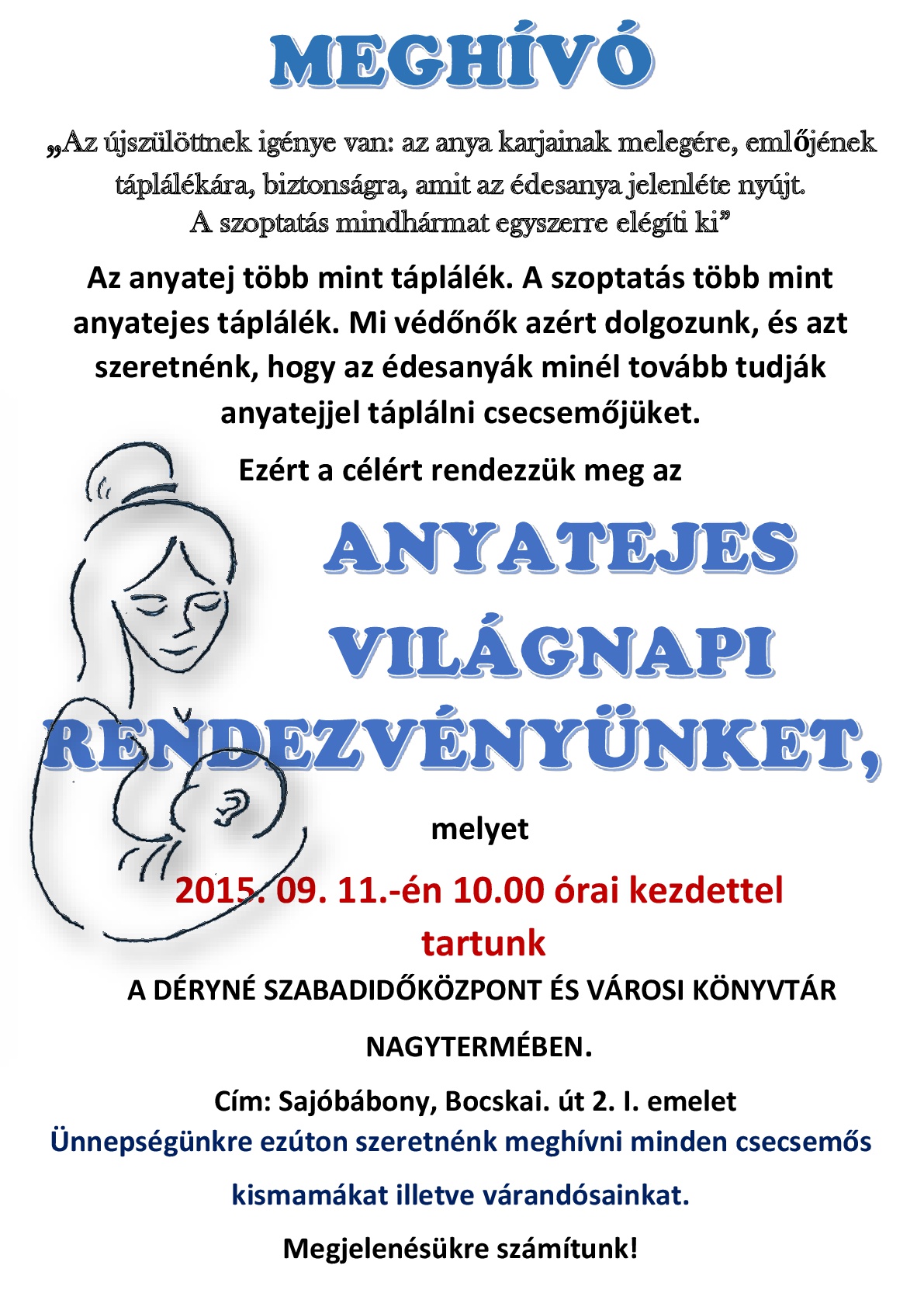 Posted inEgészségügy Lakossági Anyatejes világnap! 2017-08-17 Anyatejes világnapi rendezvény a Déryné Szabadidőközpontban, bővebb információ az alábbi plakáton!