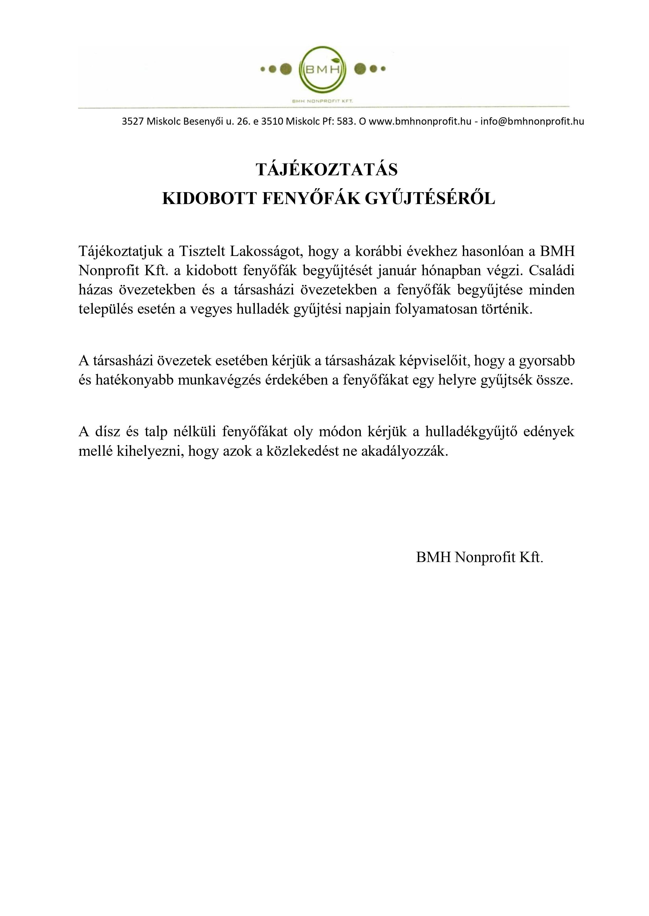 BMH – TÁJÉKOZTATÁS KIDOBOTT FENYŐFÁK GYŰJTÉSÉRŐL