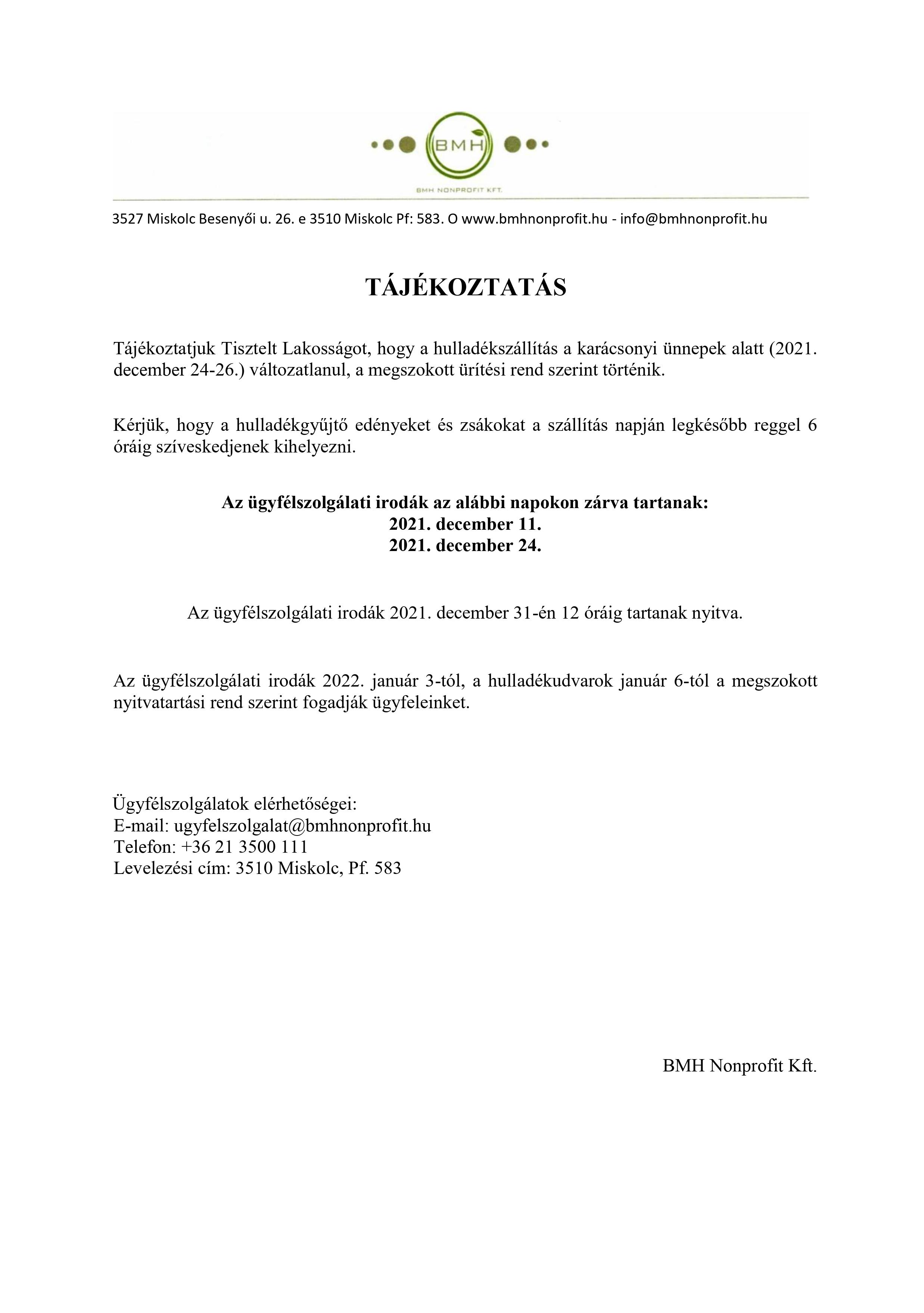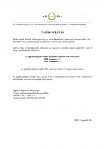 Tisztelt Sajóbábonyi Lakosok! Tisztelt Ügyfelek! Tájékoztatom a Tisztelt Ügyfeleket, hogy Sajóbábony Város Önkormányzata Képviselő-testülete – 207/2021. (XI.26.) számú önkormányzati határozatában a Polgármesteri Hivatalban az éves szabadság kiadására 2021. december…