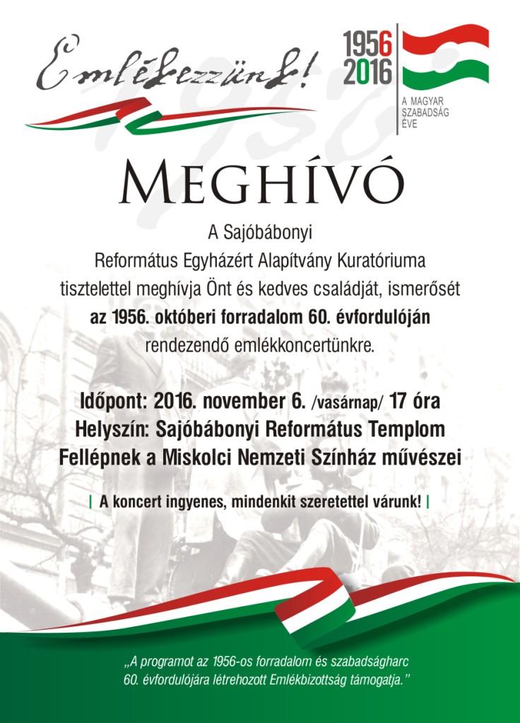 Posted inDSZKVK Egyéb Egyházak Lakossági Emlékkoncert a református templomban 2016-11-02 Szeretettel hívjuk és várjuk Önt és kedves családját, ismerőseit az 1956. októberi forradalom és szabadságharc 60. évfrodulóján megrendezésre kerülő emlékkoncertre.