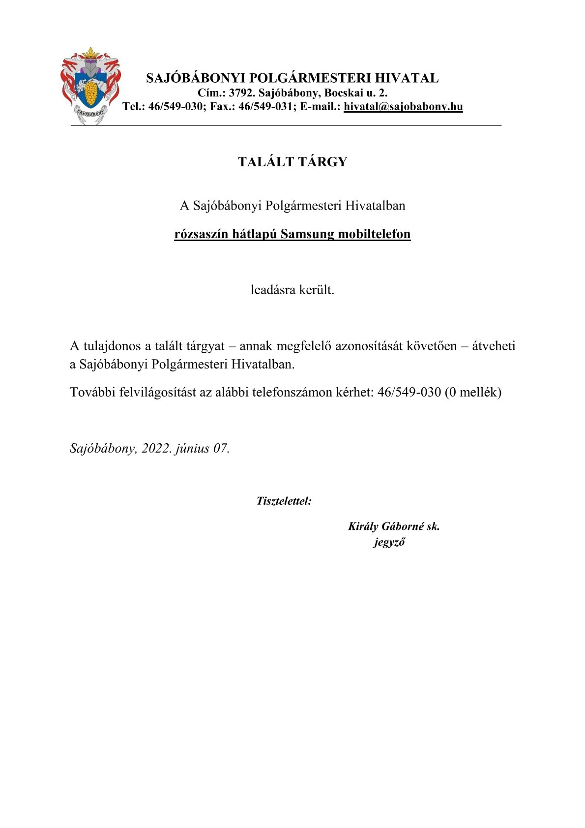TALÁLT TÁRGY  A Sajóbábonyi Polgármesteri Hivatalban rózsaszín hátlapú Samsung mobiltelefon  leadásra került.  A tulajdonos a talált tárgyat – annak megfelelő azonosítását követően – átveheti a Sajóbábonyi Polgármesteri Hivatalban. További felvilágosítást az alábbi telefonszámon kérhet: 46/549-030 (0 mellék)  Sajóbábony, 2022. június 07.                  Tisztelettel: Király Gáborné sk.          jegyző