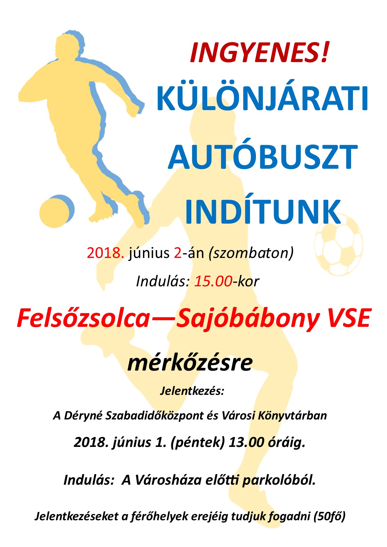 Posted inDSZKVK Sport FELSŐZSOLCA-SAJÓBÁBONYI VSE MÉRKŐZÉS 2018-05-30 Ingyenes autóbusz indul a „BAJNOK CSAPAT” Felsőzsolca elleni mérkőzésére! Bővebb információ, az alábbi plakáton.