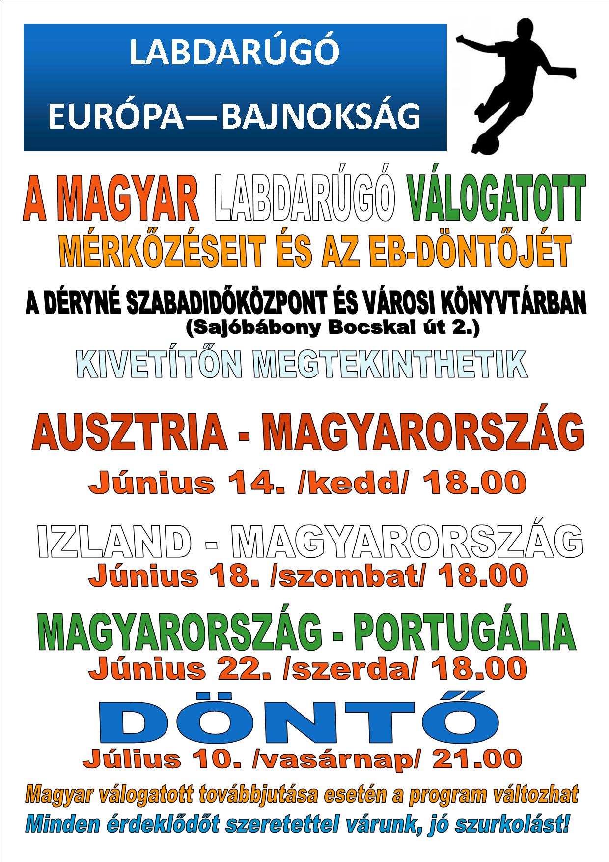 Posted inDSZKVK Egyéb Lakossági FOCI EB-Szurkoljunk együtt Magyarország csapatának 2016-06-07 A Déryné Szabadidőközpont és Városi Könyvtár szervezésében szurkoljunk együtt a futball Európa Bajnokságon Magyarország csapatának.