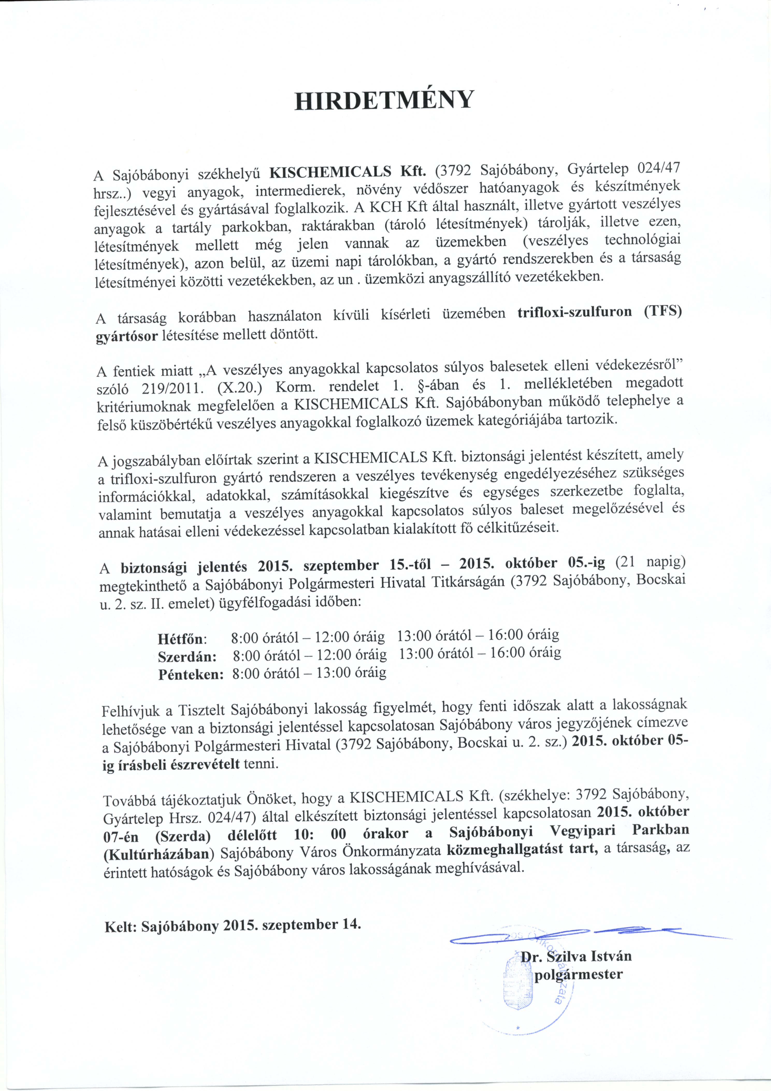 A KISCHEMICALS Kft. által elkészített biztonsági jelentéssel kapcsolatosan 2015. október 07-én (Szerda) délelőtt 10.00 órakor a Sajóbábonyi Vegyipari Parkban (Kultúrházban) Sajóbábony Város Önkormányzata közmeghallgatást tart, a társaság és az érintett hatóságok és Sajóbábony város lakosságának meghívásával.