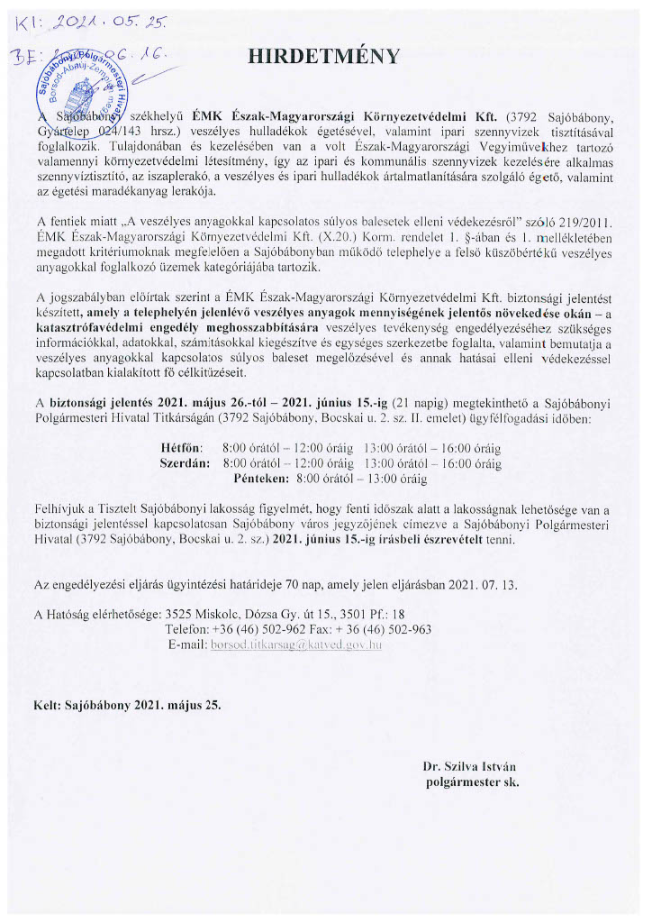 Hirdetmény. ÉMK biztonsági jelentés megtekintése
