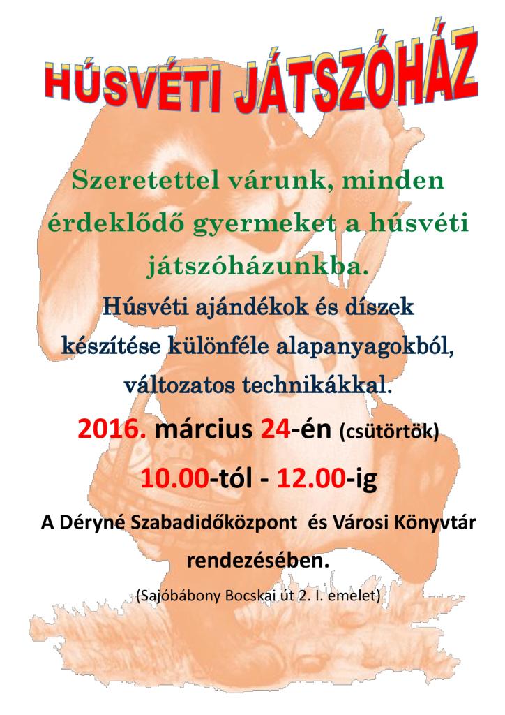 Posted inDSZKVK Egyéb Lakossági Húsvéti játszóház 2016-03-17 A Déryné Szabadidőközpont és Városi Könyvtár Húsvéti játszóházban hívja és várja a sajóbábonyi gyermekeket