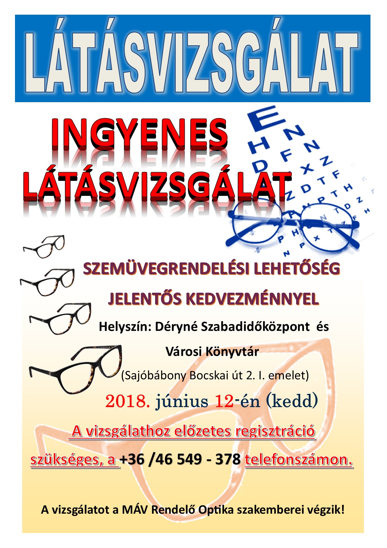 Posted inDSZKVK Lakossági Ingyenes látásvizsgálat Sajóbábonyban 2018-05-23 A Déryné Szabadidőközpont és Városi Könyvtár látásvizsgálatot szervez, melyre minden érdeklődőt tisztelettel vár. A vizsgálat regisztrációhoz kötött. Bővebb információ az alábbi plakáton.