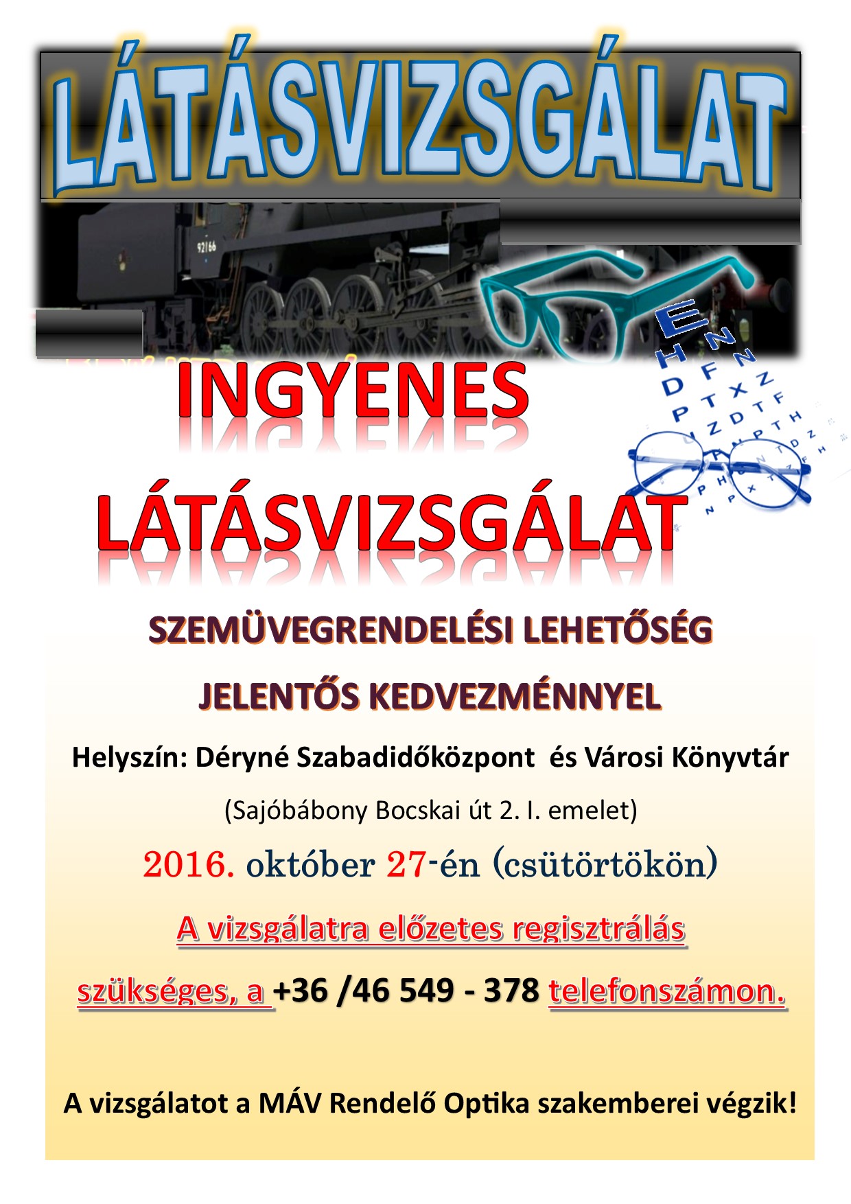 Posted inDSZKVK Egészségügy Egyéb Lakossági Ingyenes látásvizsgálat Sajóbábonyban 2016-10-18 A Déryné Szabadidőközpont és Városi Könyvtár ingyenes látásvizsgálatot szervez.