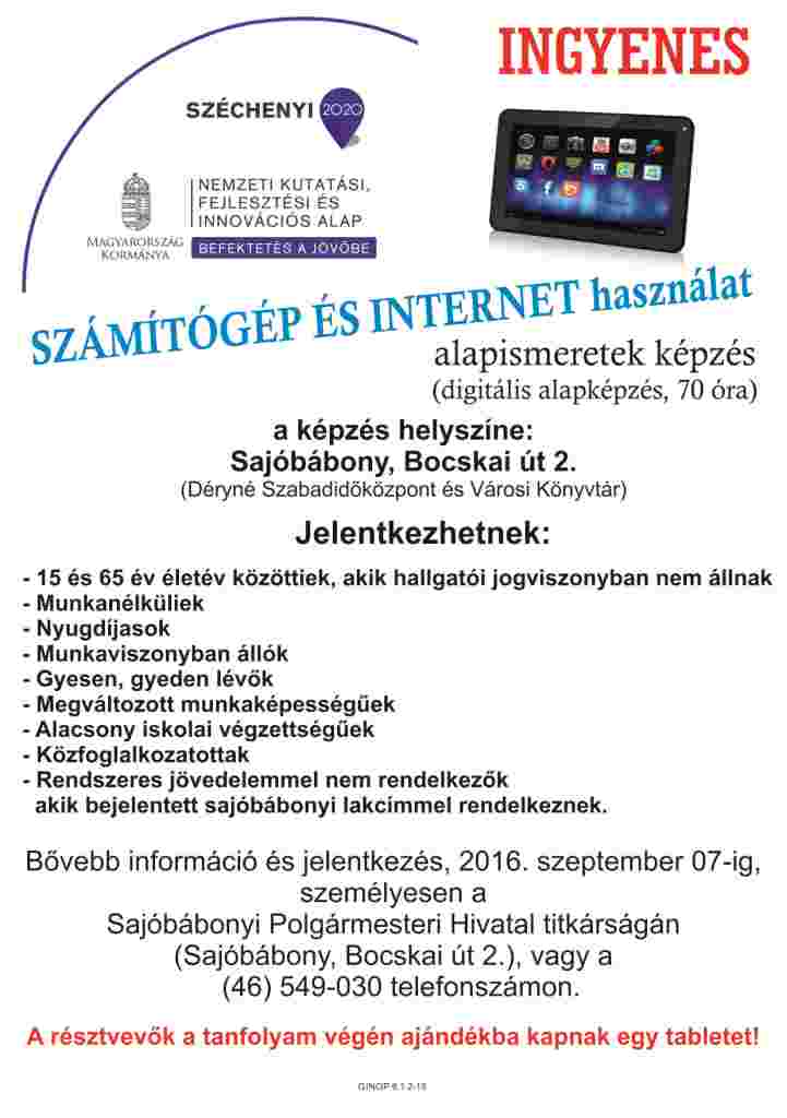 Ingyenes számítógép és internet használat alapismeretek képzés (digitális alapképzés, 70 óra) indul. A résztvevők a tanfolyam végén ajándékba kapnak egy tabletet!Digitális__00001_t