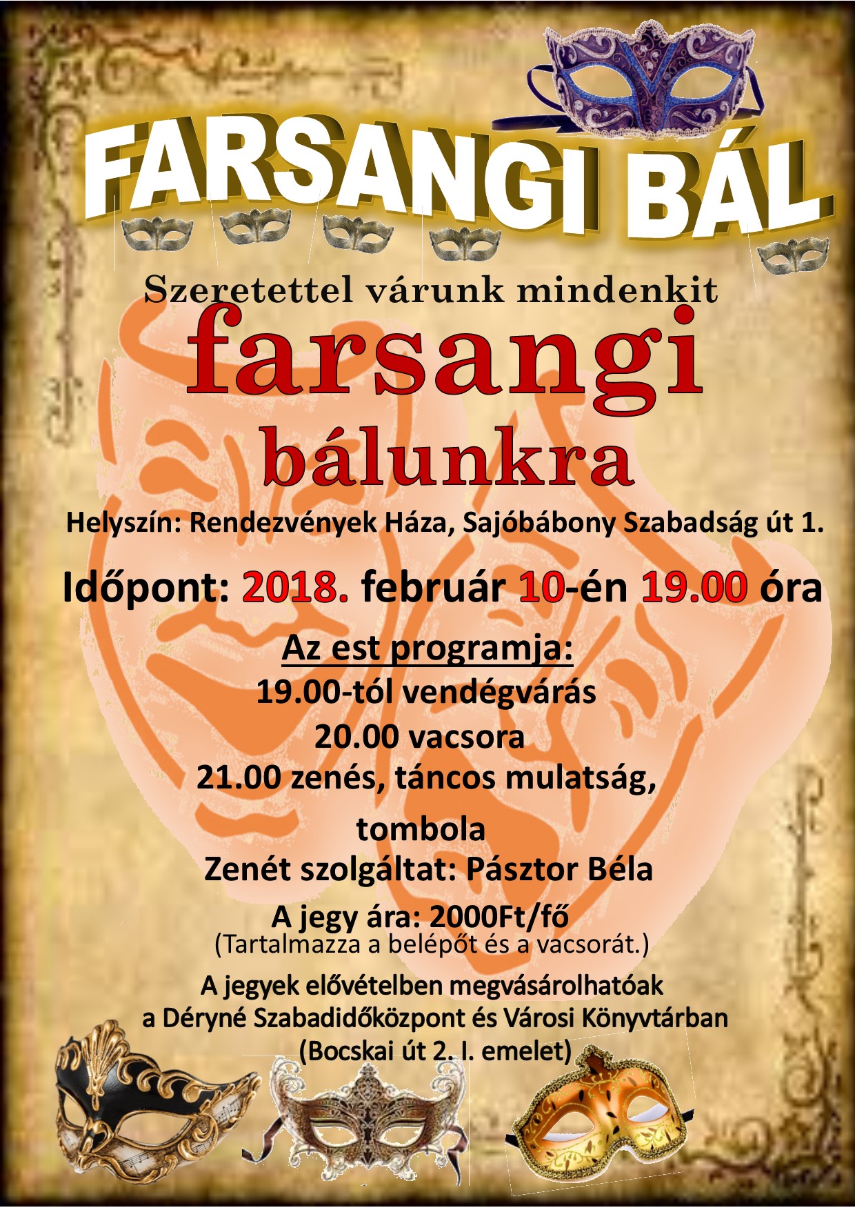 Színházi maszk_icoA Déryné Szabadidőközpont és Városi Könyvtár 2018.02. 10-én Farsangi Bált szervez, amelyre Mindenkit szeretettel vár!