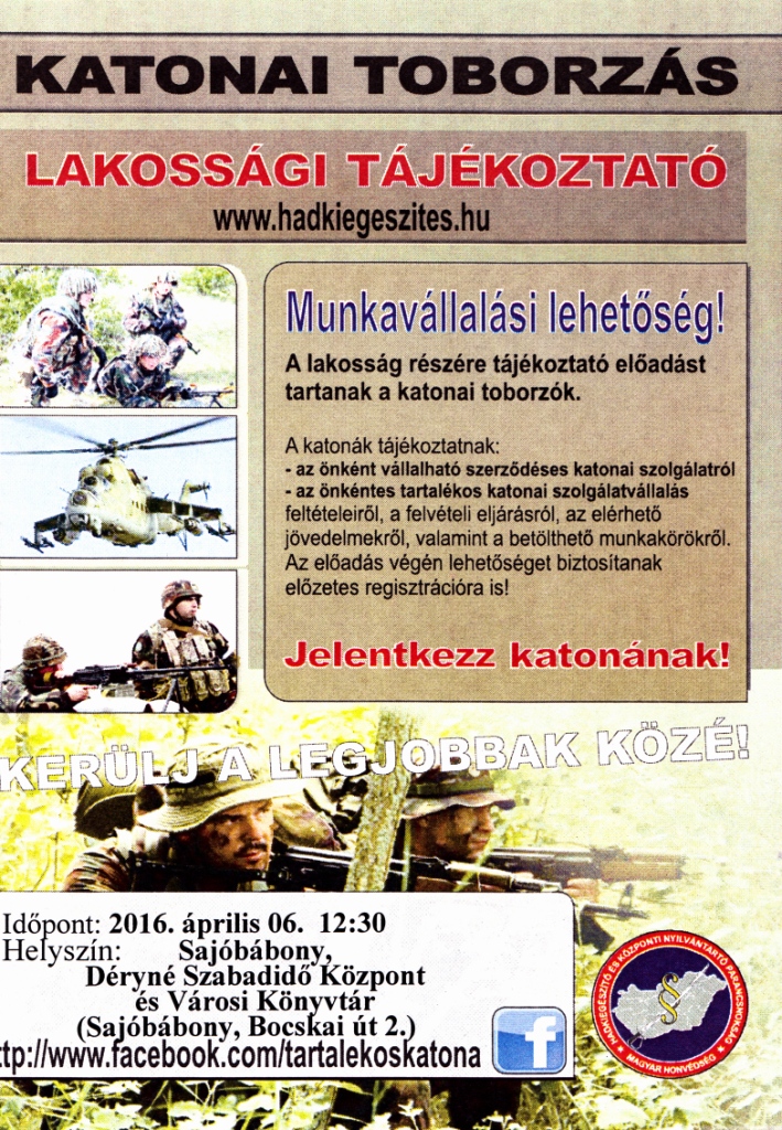 Posted inDSZKVK Egyéb Lakossági Katonai toborzás 2016-03-25 A Déryné Szabadidőközpont és Városi Könyvtárban a lakosság részére tájékoztató előadást tartanak a katonai toborzók, 2016. április 06-án 12 óra 30 perctől.