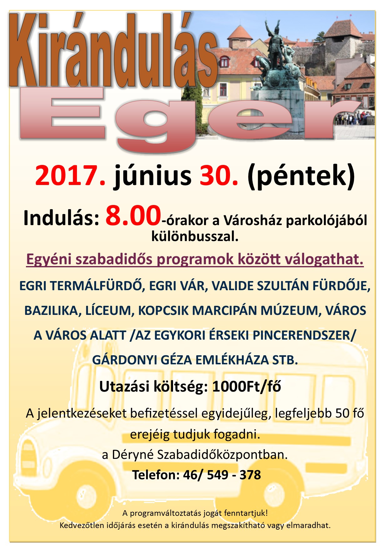 A Déryné Szabadidőközpont és Városi Könyvtár kirándulást szervez Egerbe. Bővebb információ az alábbi plakáton! Illetve érdeklődni lehet személyesen a Déryné Szabadidőközpontban ( Sajóbábony, Bocskai út 2.) és a 06-46/549-378 telefonszámon.
