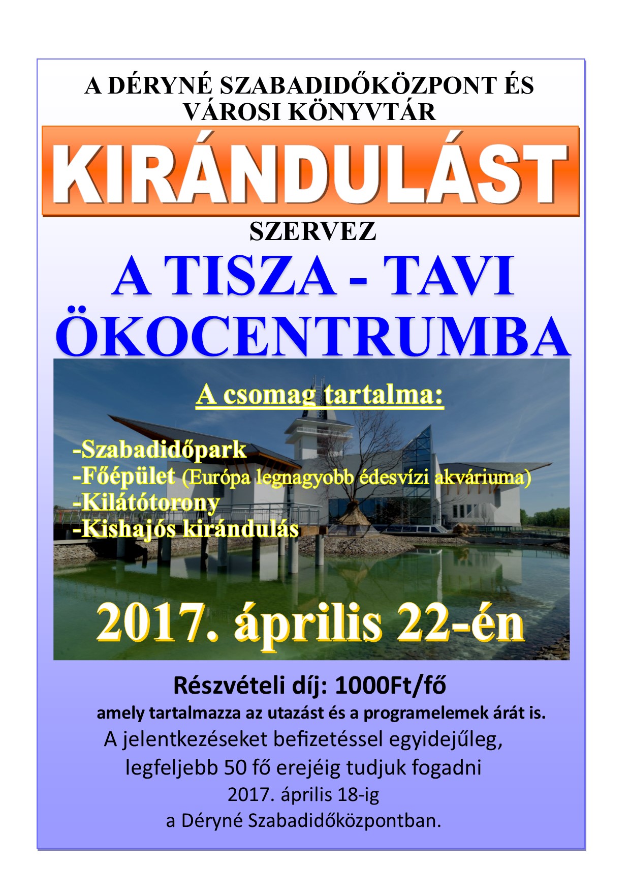 Posted inDSZKVK Egyéb Lakossági Kirándulás a Poroszlóra 2017-04-03 Kirándulást szervezünk Poroszlóra a Tisza-Tavi Ökocentrumba.