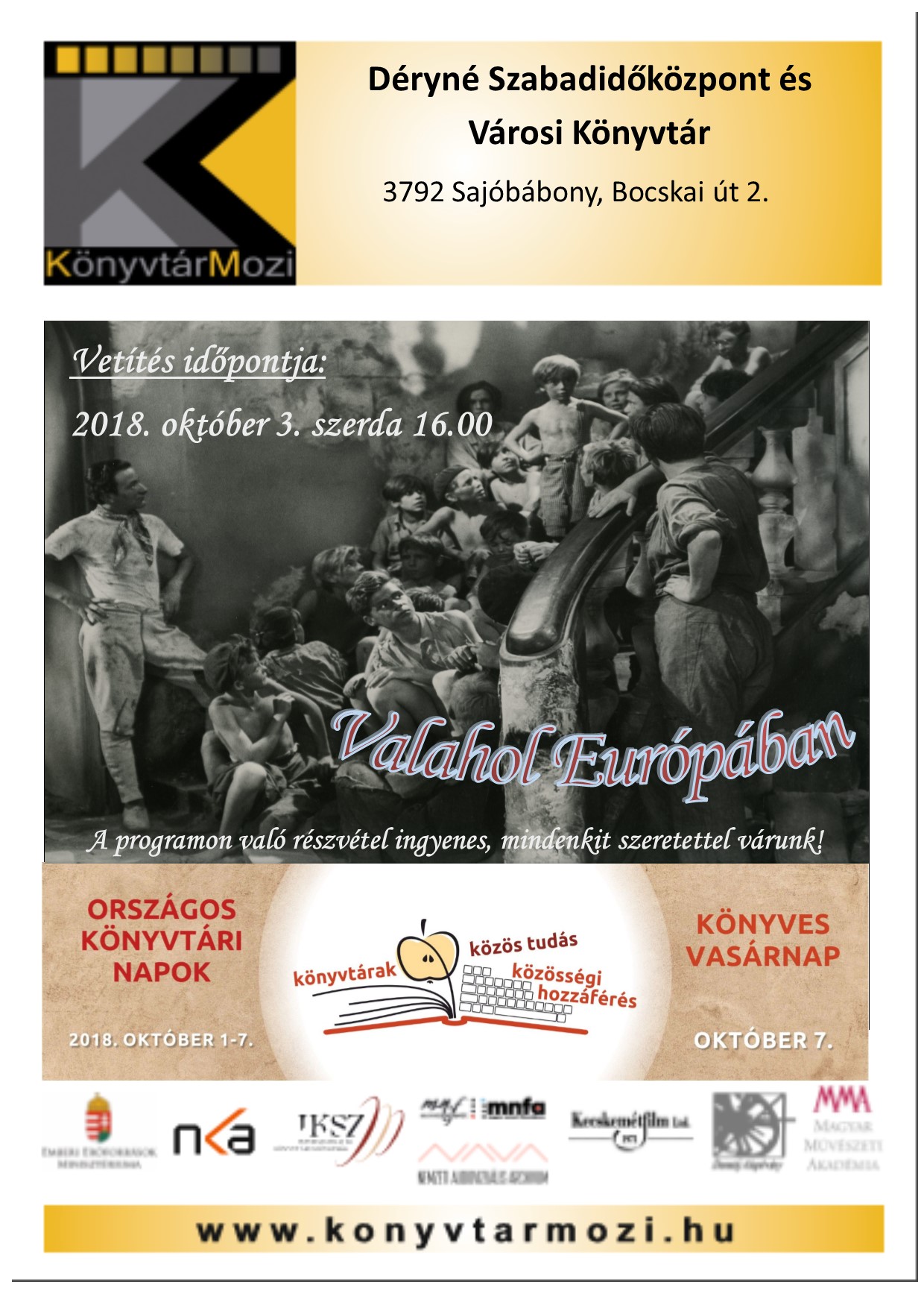 2018. október 03-án (szerdán) 16.00 órától a könyvtárban vetítésre kerül a Valahol Európában című film. Minden érdeklődőt szeretettel várunk!