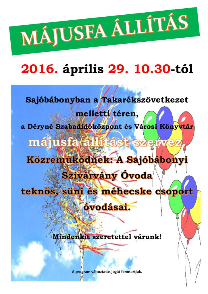 Posted inDSZKVK Egyéb Lakossági Májusfa állítás 2016-04-25 A Déryné Szabadidőközpont és Városi Könyvtár májusfa állítást szervez a Takarék melletti téren, 2016. április 29-én, 10.30 -kor. Közreműködnek a Sajóbábonyi Szivárvány Óvoda Teknős, Süni és Méhecske csoportjai. Szeretettel várunk mindenkit!