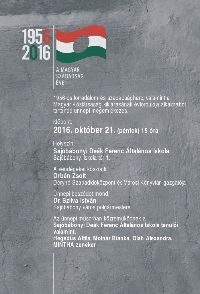 Posted inDSZKVK Egyéb Lakossági Megemlékező ünnepség 2016-10-12 Sajóbábony Város Önkormányzata tisztelettel meghívja Önt és kedves családját az 1956-os forradalom és szabadságharc valamint a Magyar Köztársaság kikiáltásának évfordulója alkalmából tartandó ünnepségre.