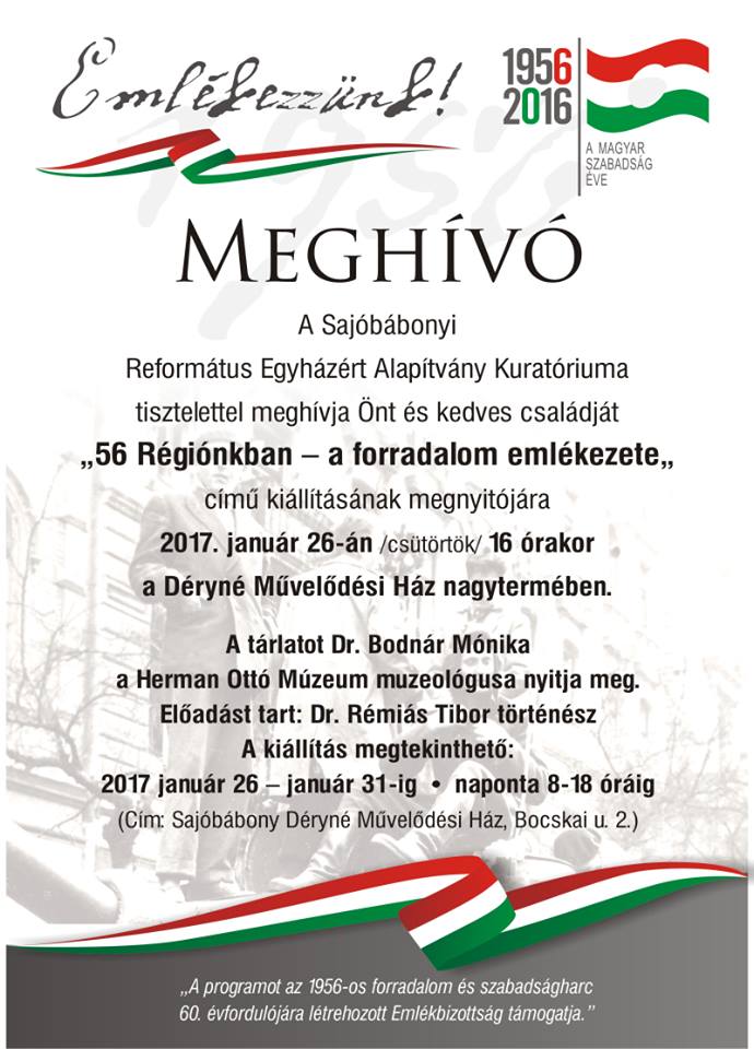 Posted inDSZKVK Egyéb Lakossági Meghívó 2017-01-23 Tisztelettel hívjuk és várjuk Önt és kedves családját az „56 Régiónkban – a forradalom emlékezete” című kiállítás megnyitójára, a Déryné Szabadidőközpont és Városi Könyvtár nagytermébe, 2017. január 26-án, 16 órára.