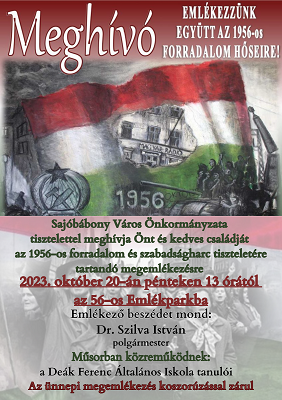 Sajóbábony Város Önkormányzata tisztelettel meghívja Önt és kedves családját az 1956-os forradalom és szabadságharc, valamint a Magyar Köztársaság kikiáltásának évfordulója alkalmából tartandó ünnepi megemlékezésre. Bővebb információ az alábbi plakáton: