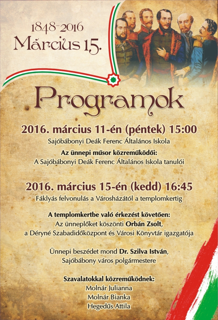 Posted inDSZKVK Egyéb Lakossági Meghívó 2016-03-08 Sajóbábony Város Önkormányzata és a Déryné Szabadidőközpont és Városi Könyvtár tisztelettel meghívja Önt és kedves családját az 1848-49 évi magyar forradalom és szabadságharc tiszteletére rendezett ünnepi programjaira.