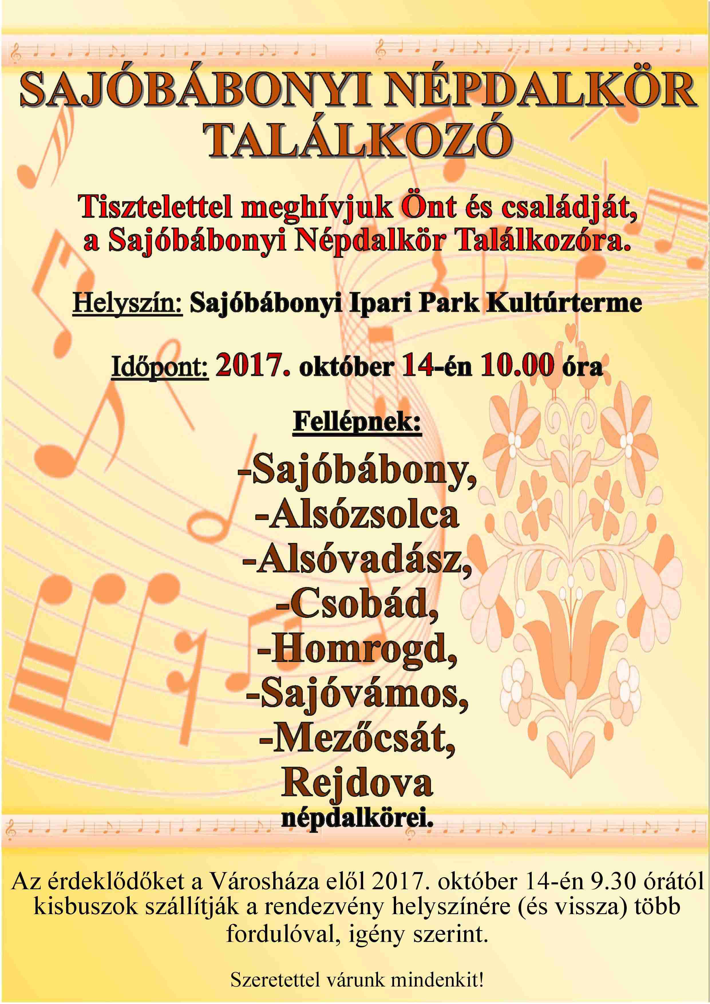 Posted inDSZKVK Egyéb Népdalkörök találkozója 2017-10-09 A Déryné Szabadidőközpont és Városi Könyvtár szervezésében népdalkör találkozóra várjuk a tisztelt érdeklődőket a Sajóbábonyi Vegyipari Park Kultúrtermébe, 2017. október 14-én, szombaton.