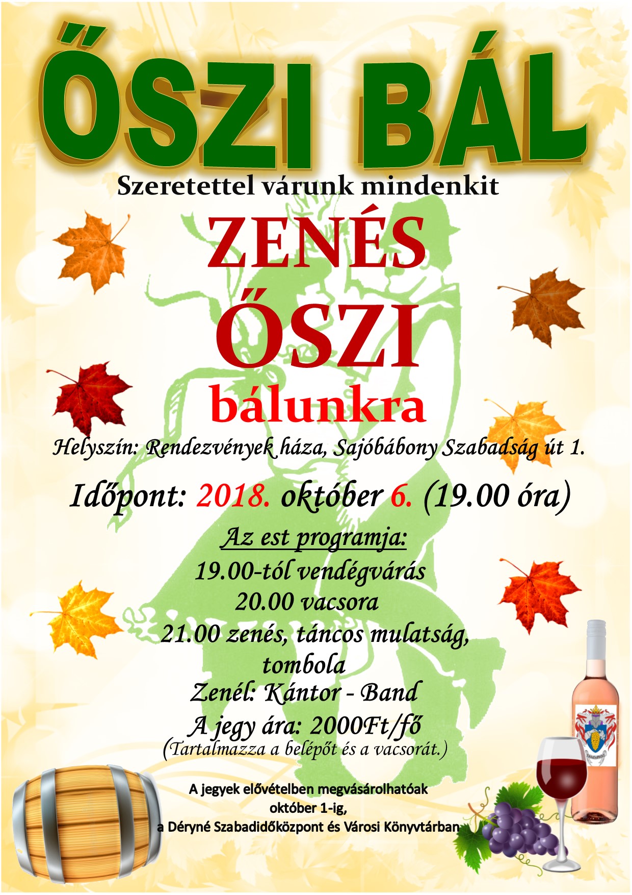 A Déryné Szabadidőközpont és Városi Könyvtár 2018.10. 06-án Őszi Bált szervez, amelyre Mindenkit szeretettel vár! Helyszín: Rendezvények Háza, Sajóbábony, Szabadság út 1. Jegyek korlátozott számban (2000 Ft) megvásárolhatók, a Déryné Szabadidőközpontban: Hétfő – Csütörtök: 8.00-16.00, Péntek: 8-13.30 óra között.