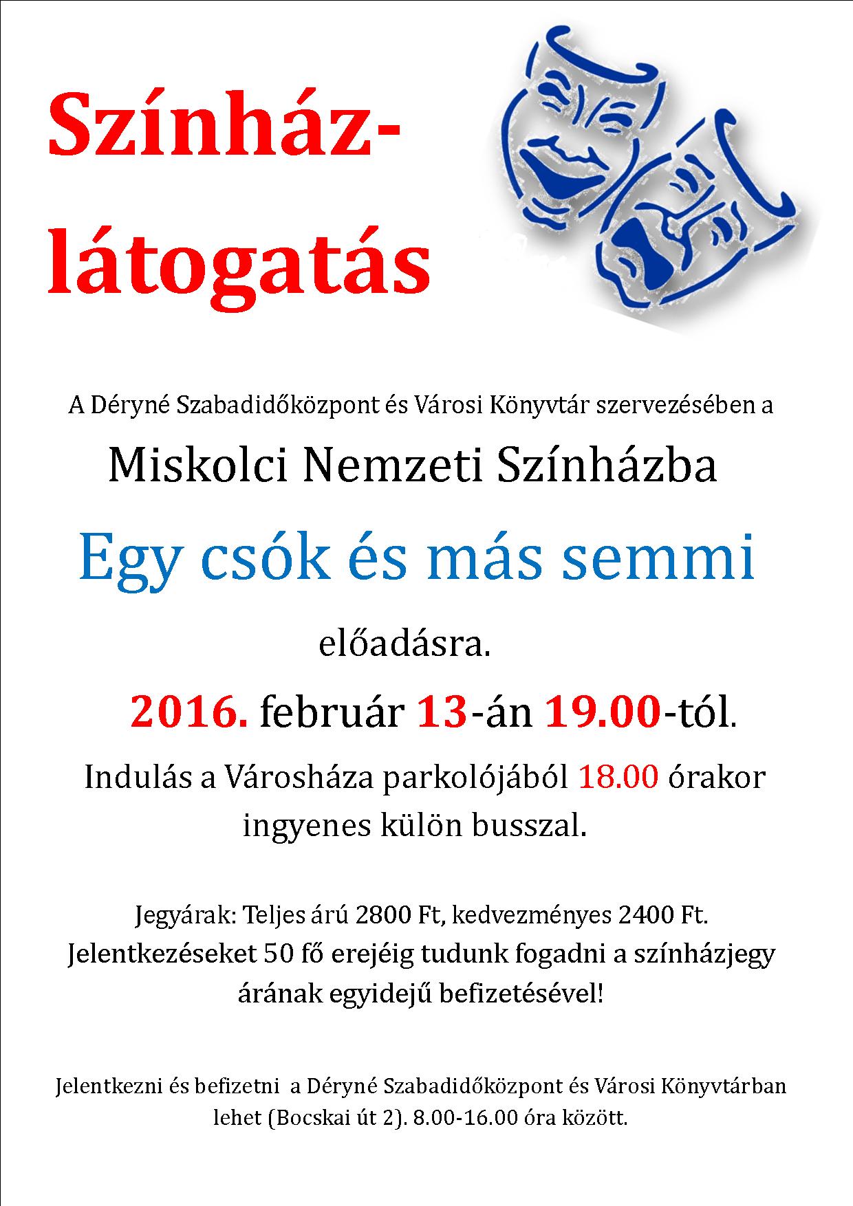 Posted inDSZKVK Színházlátogatás 2016-01-14 A Déryné Szabadidőközpont és Városi Könyvtár színházlátogatást szervez.