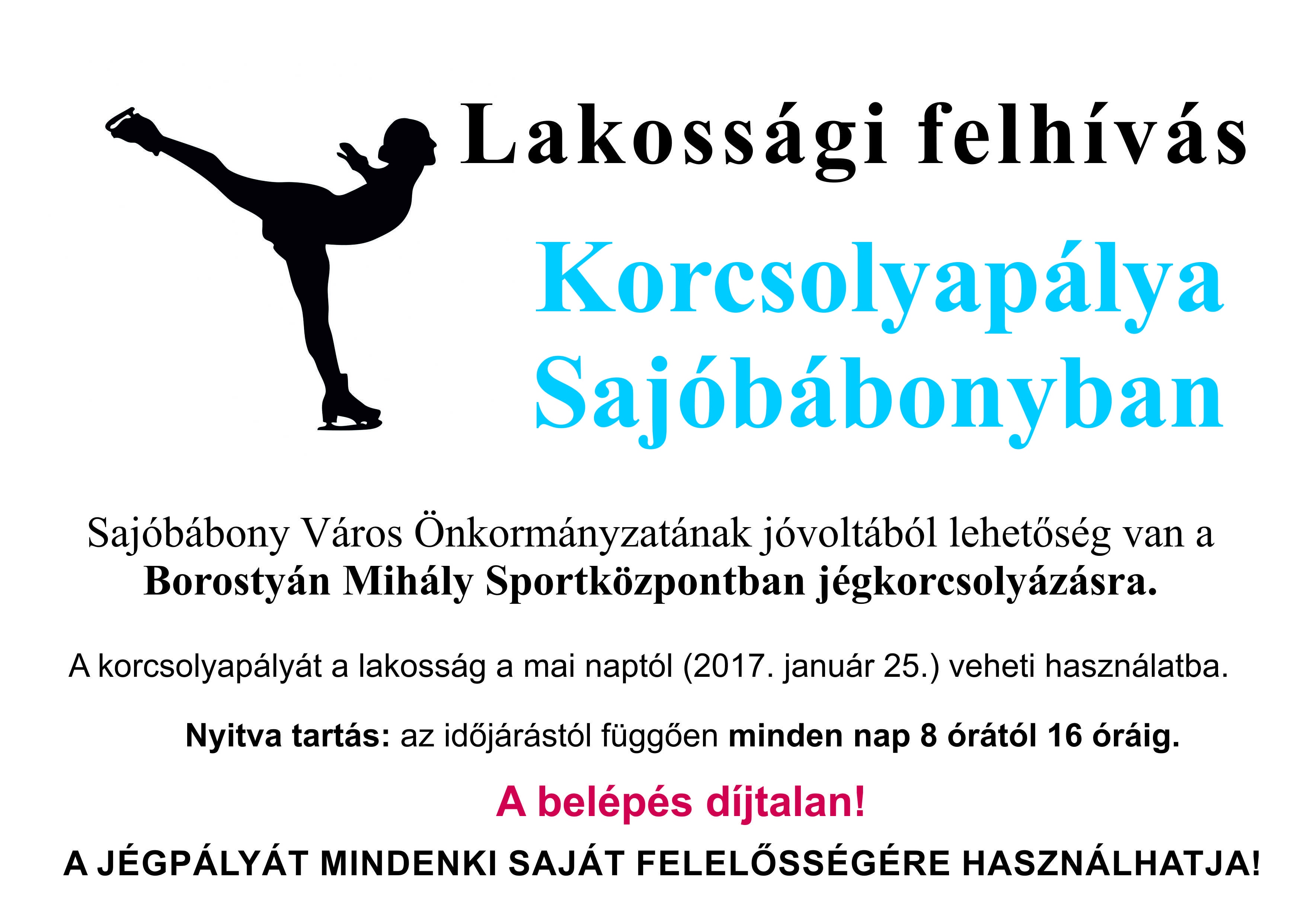Posted inDSZKVK Lakossági Tájékoztatás 2017-01-26 2017. évben Sajóbábony Város Önkormányzatának jóvoltából, hosszú évek után újra lehetőség nyílik a Borostyán Mihály Sportközpontban lévő bitumenes pályán, jégkorcsolyázásra.