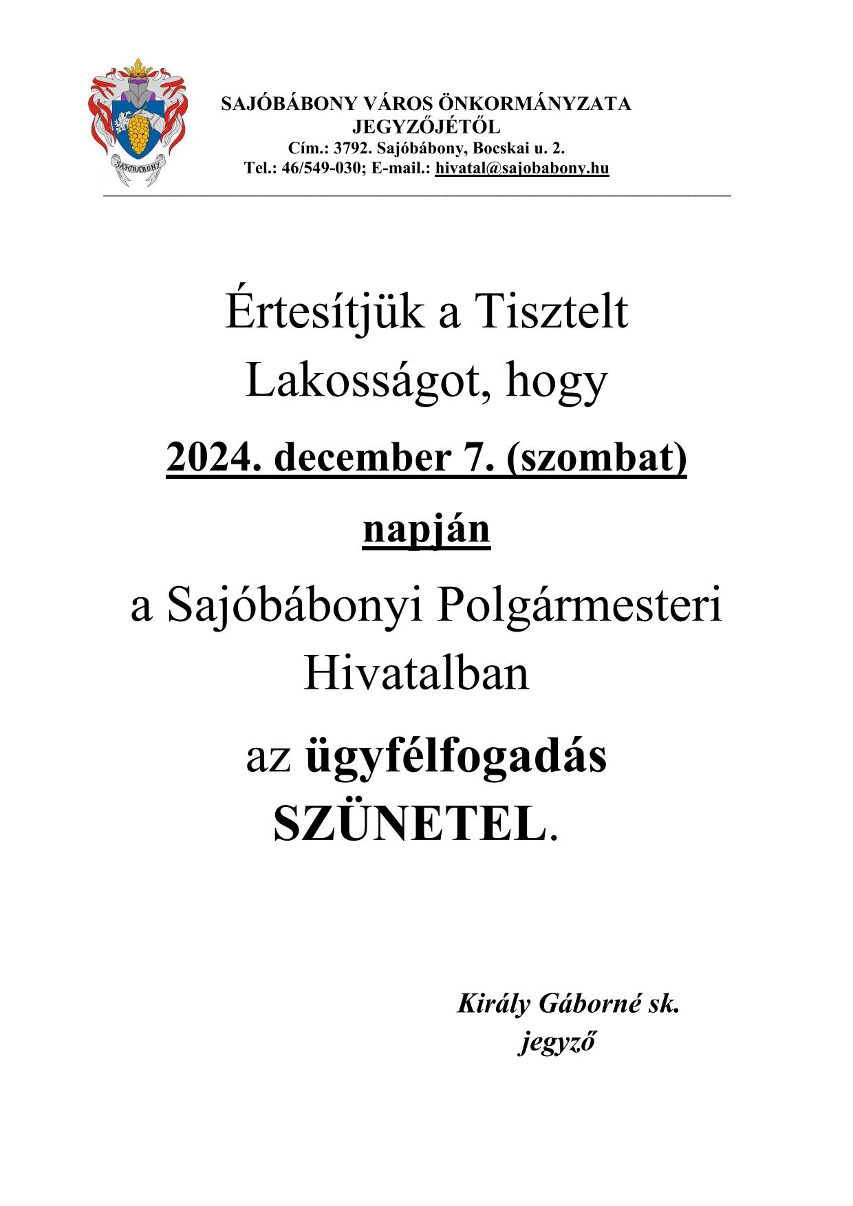 Értesítjük a Tisztelt Lakosságot, hogy 2024. december 7. (szombat) napján a Sajóbábonyi Polgármesteri Hivatalban az ügyfélfogadás SZÜNETEL. Király Gáborné sk. jegyző
