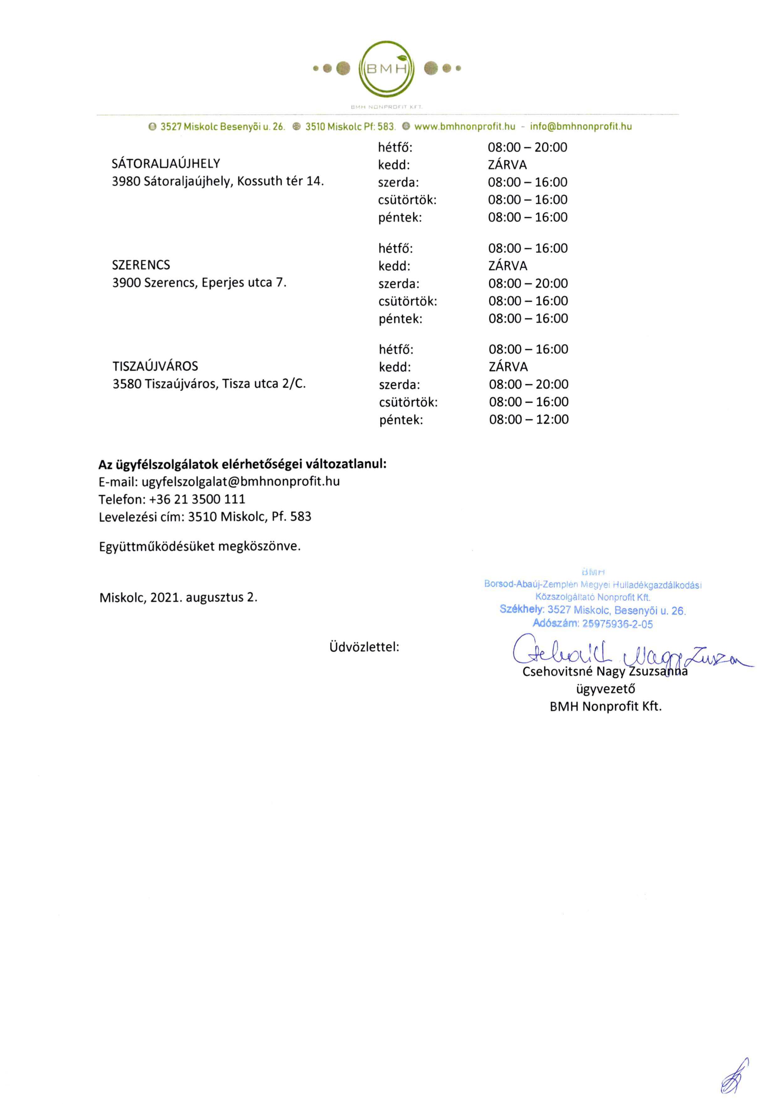 Tájékoztatás az ügyfélszolgálati irodák nyitvatartási rendjéről