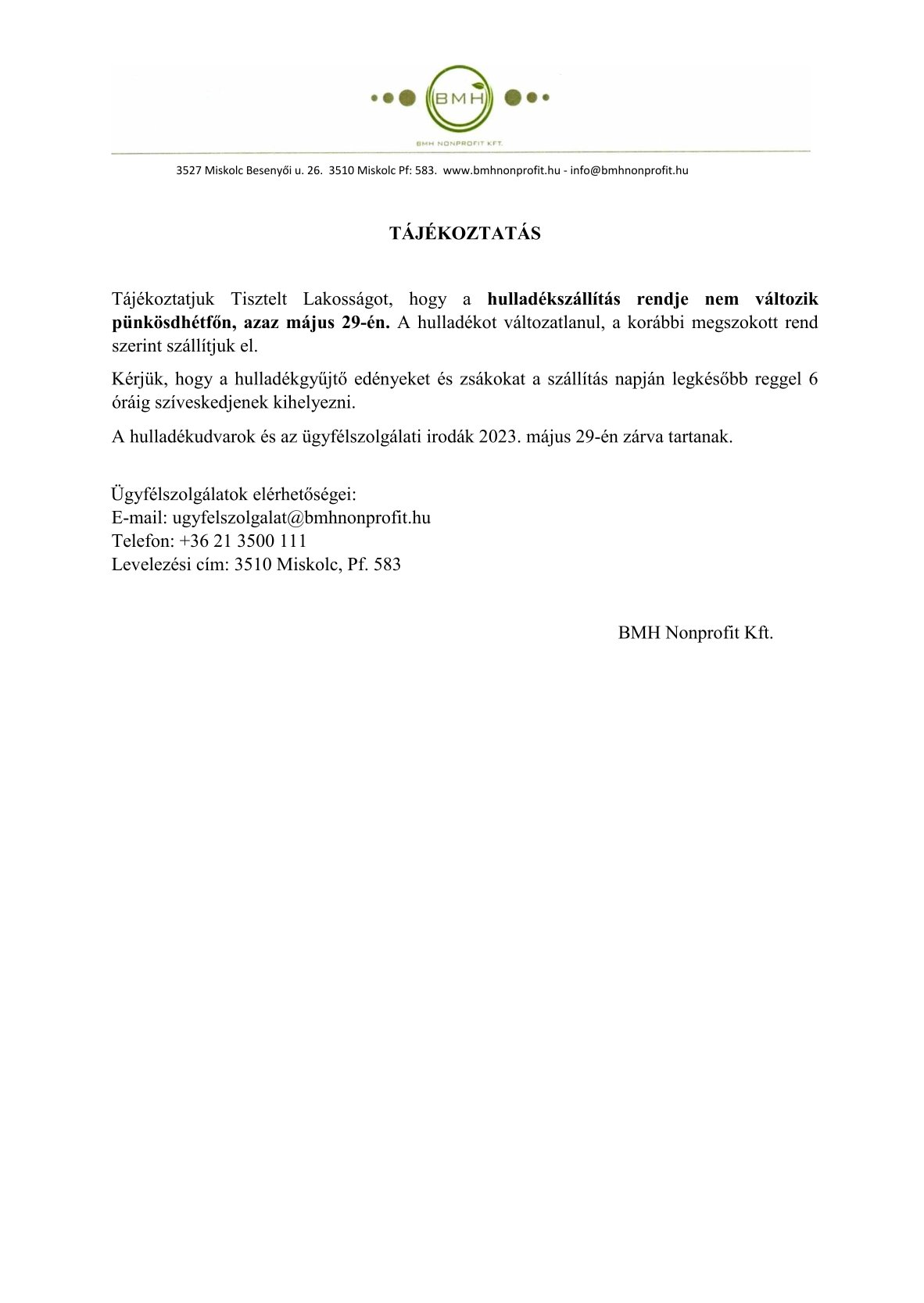 Tájékoztatás-BMH Nonprofit Kft.