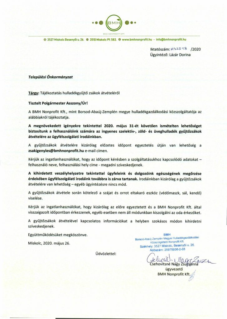 Tájékoztatás – hulladékgyűjtő zsákok átvételéről