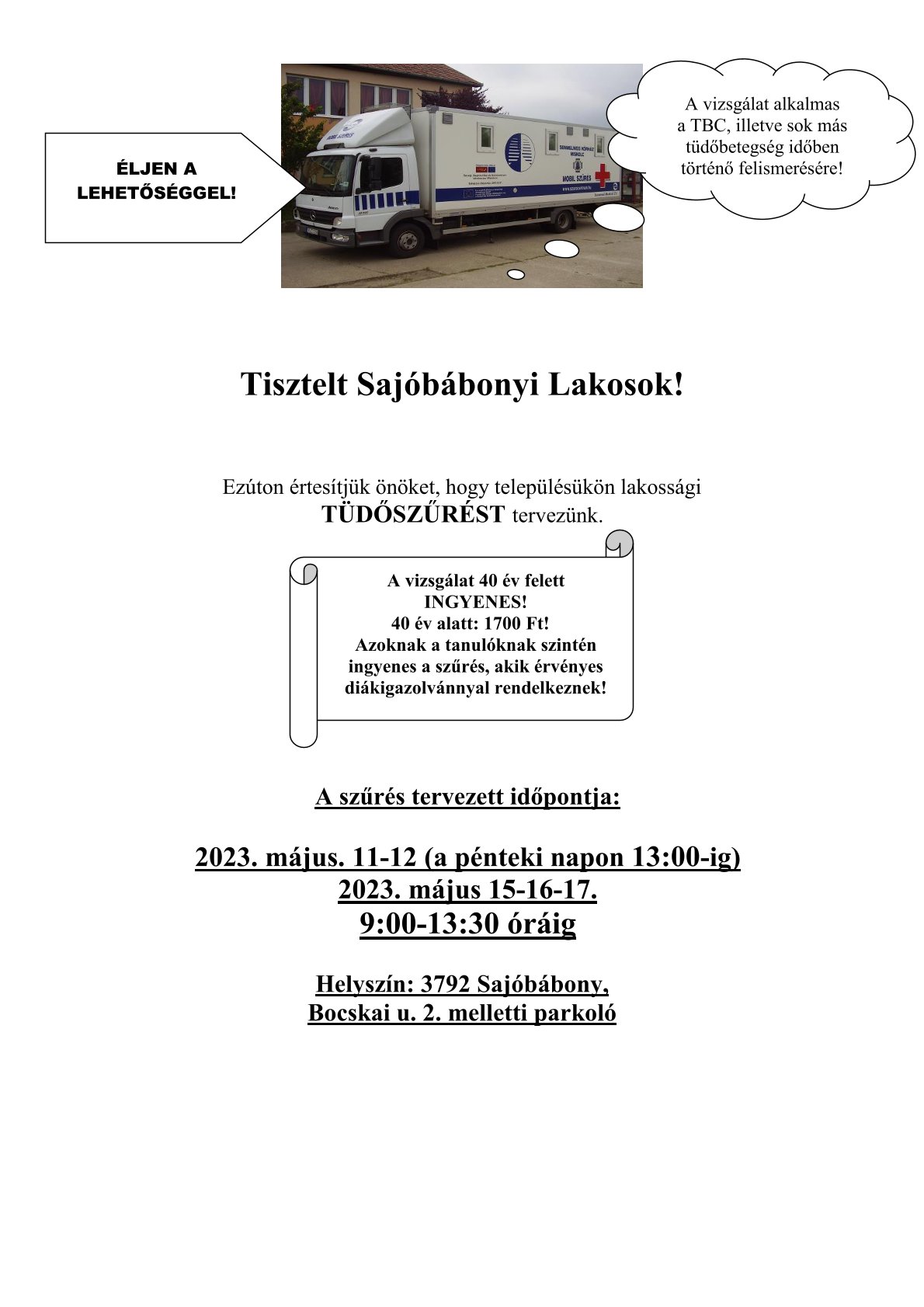 Tisztelt Sajóbábonyi Lakosok! Ezúton értesítjük önöket, hogy településükön lakossági TÜDŐSZŰRÉST tervezünk. A szűrés tervezett időpontja: 2023. május. 11-12 (a pénteki napon 13:00-ig) 2023. május 15-16-17. 9:00-13:30 óráig Helyszín: 3792 Sajóbábony, Bocskai u. 2. melletti parkoló A vizsgálat 40 év felett INGYENES! 40 év alatt: 1700 Ft! Azoknak a tanulóknak szintén ingyenes a szűrés, akik érvényes diákigazolvánnyal rendelkeznek! A vizsgálat alkalmas a TBC, illetve sok más tüdőbetegség időben történő felismerésére! ÉLJEN A LEHETŐSÉGGEL!