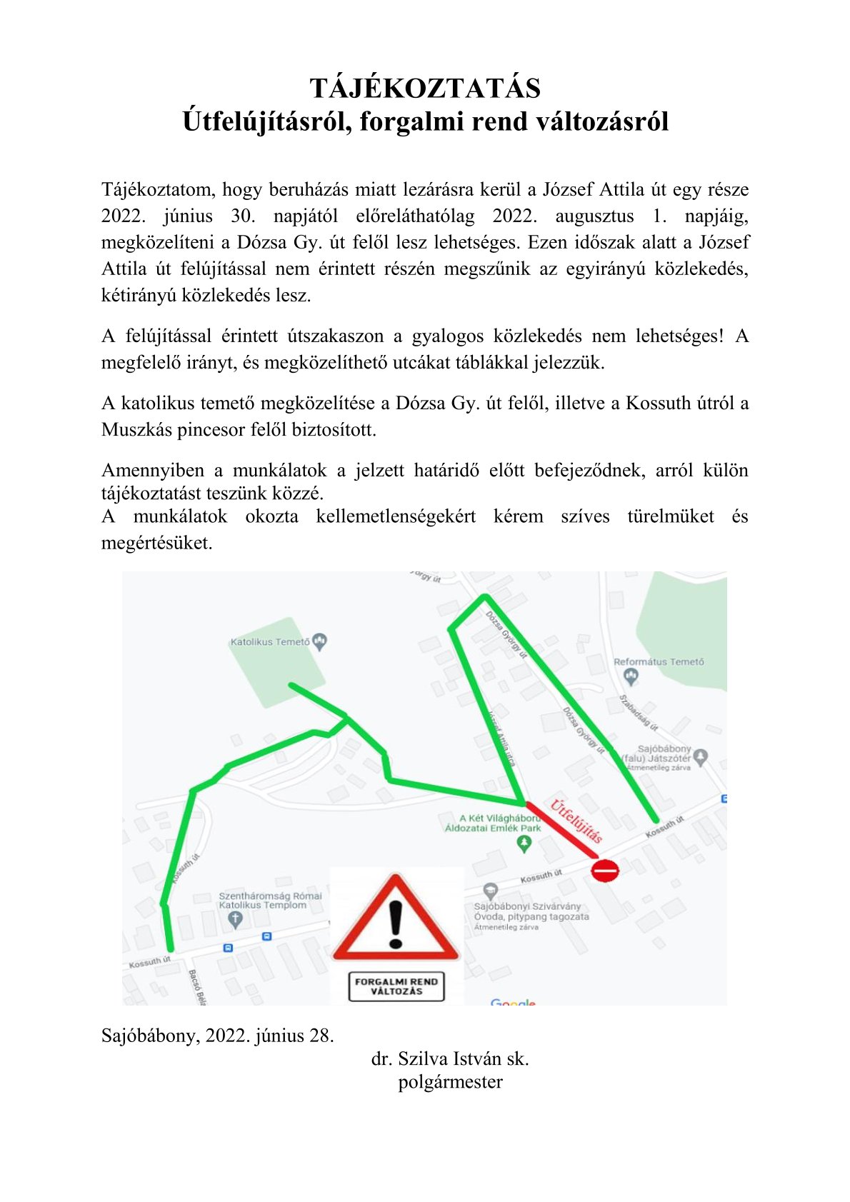 Tájékoztatás-Útfelújítás, forgalmi rend változás