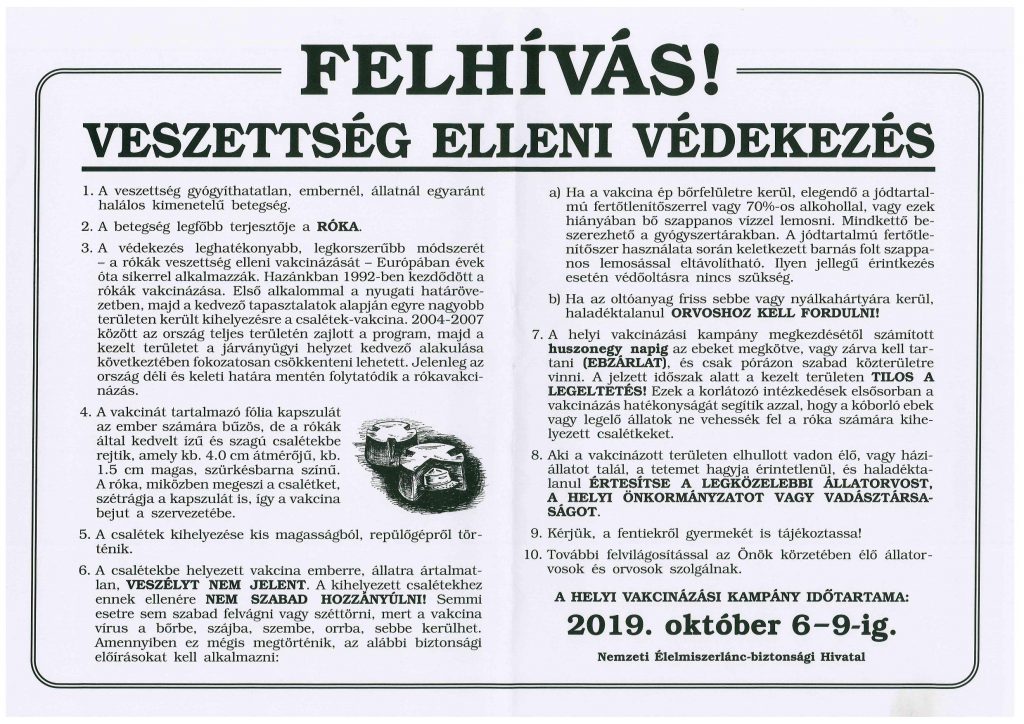 Tájékoztatás – veszettség elleni védekezés