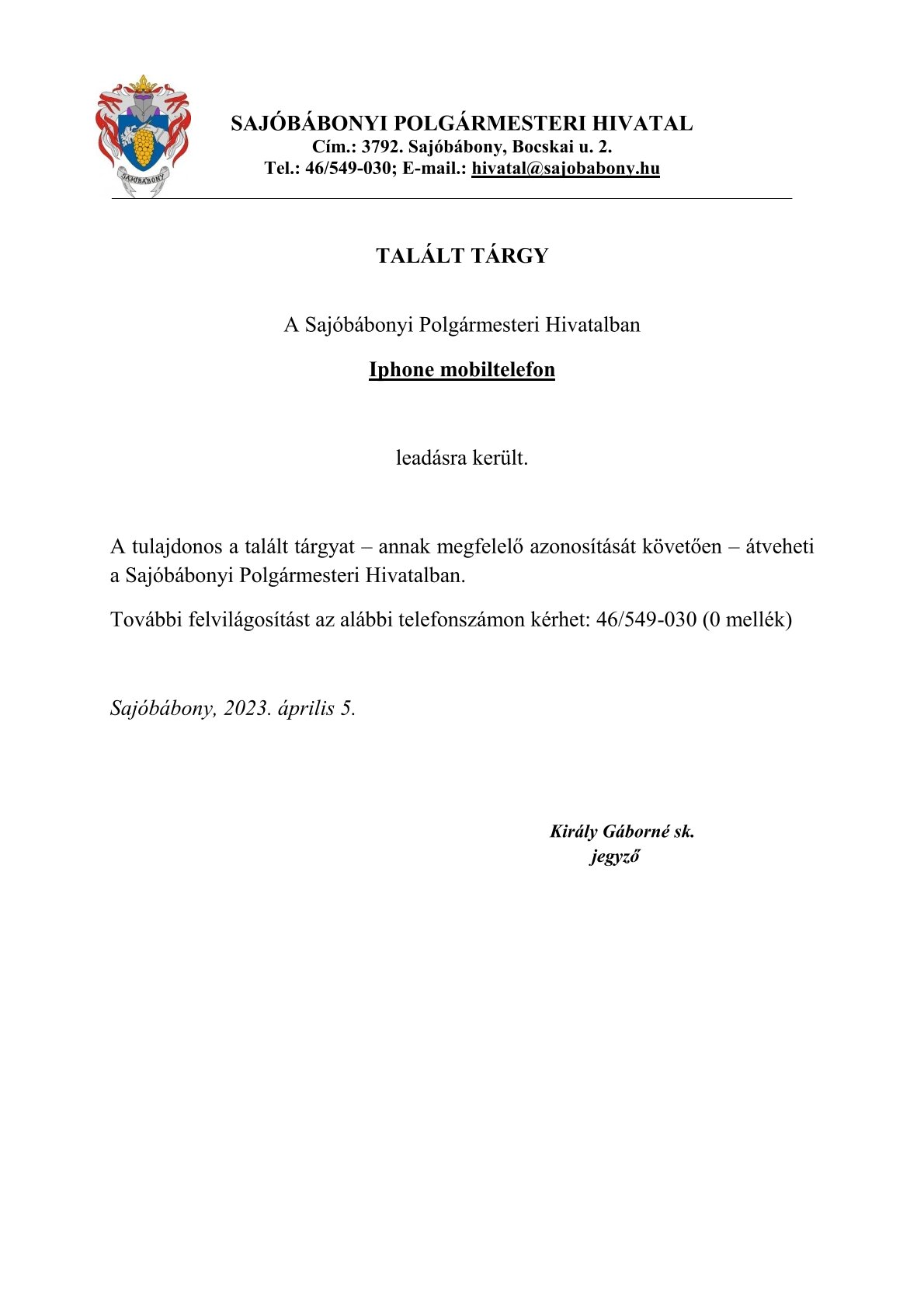 TALÁLT TÁRGY A Sajóbábonyi Polgármesteri Hivatalban Iphone mobiltelefon leadásra került. A tulajdonos a talált tárgyat – annak megfelelő azonosítását követően – átveheti a Sajóbábonyi Polgármesteri Hivatalban. További felvilágosítást az alábbi telefonszámon kérhet: 46/549-030 (0 mellék) Sajóbábony, 2023. április 5. Király Gáborné sk. jegyző