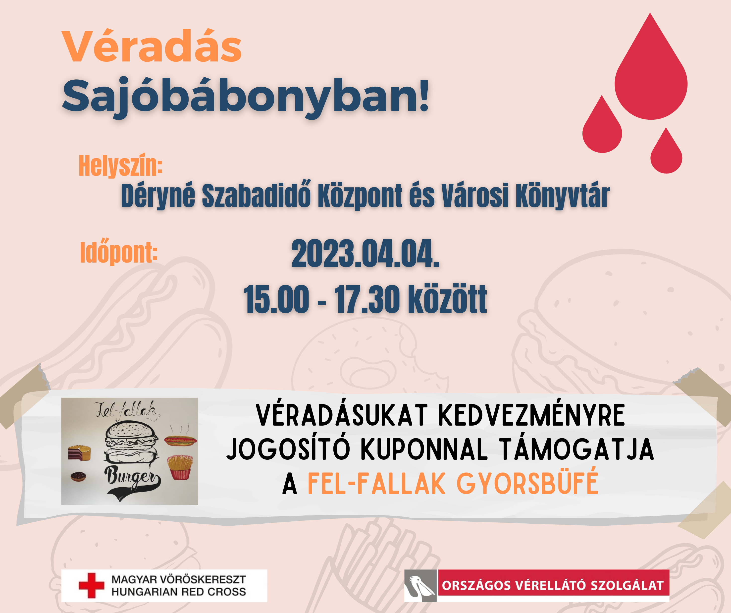 A Magyar Vöröskereszt Borsod-Abaúj-Zemplén Megyei Szervezete 2023.04.04-én (kedd) 15.00-17.30 között véradásra vár mindenkit a Déryné Szabadidőközpontba.