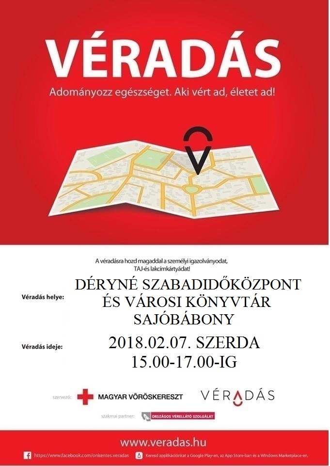 Véradásra várjuk a tisztelt lakosságot 2018. február 7-én, a Déryné Szabadidőközpontba.