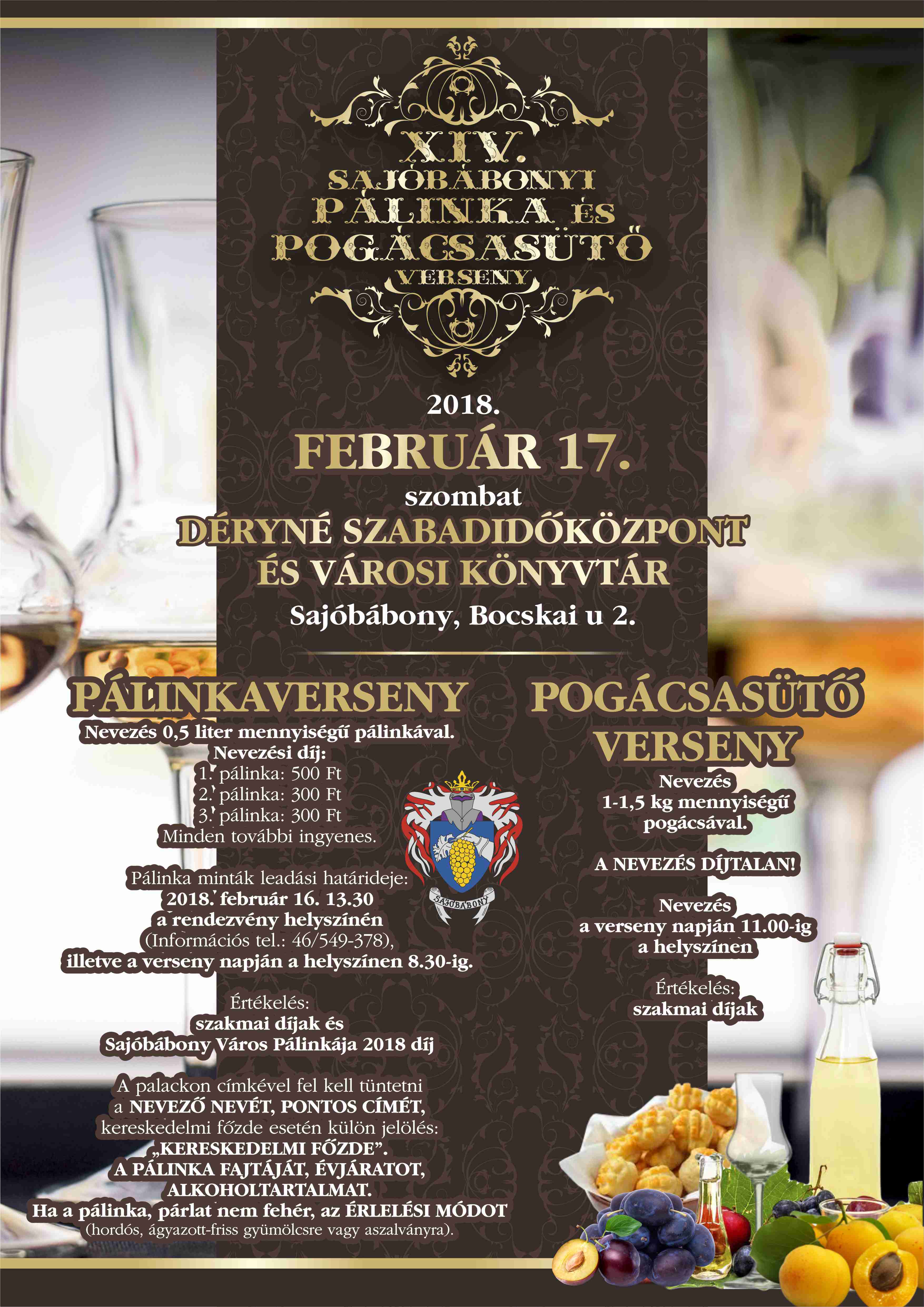 A Déryné Szabadidőközpont és Városi Könyvtár 2018.02.17-én rendezi meg a XIV Pálinka és Pogácsasütő Versenyt szervez, melyre minden érdeklődőt, nevezni vágyót tisztelettel vár!Bővebb információ az alábbi plakáton! Illetve a rendezvénnyel kapcsolatosan érdeklődni lehet személyesen a Déryné Szabadidőközpontban ( Sajóbábony, Bocskai út 2.) és a 06-46/549-378 telefonszámon.