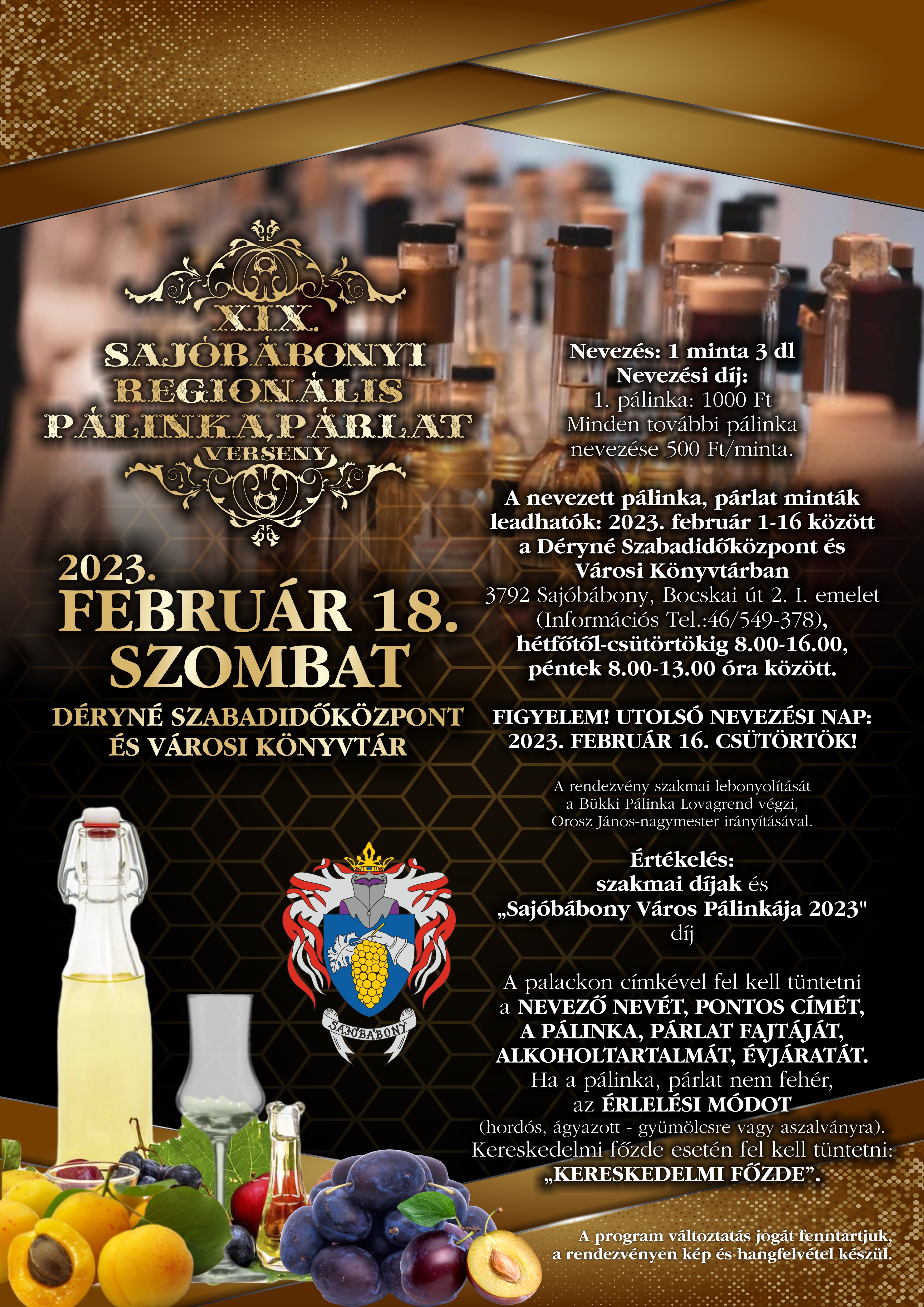 XIX. alkalommal rendezzük meg Sajóbábonyban a pálinka, párlat versenyt, amelyre az Ön nevezését is várjuk! A verseny időpontja 2023. február 18., helyszíne a Déryné Szabadidőközpont és Városi Könyvtár. Bővebb információ az alábbi plakáton, illetve a rendezvénnyel kapcsolatosan érdeklődni lehet személyesen a Déryné Szabadidőközpontban (Sajóbábony, Bocskai út 2.) és a 06-46/549-378 telefonszámon.