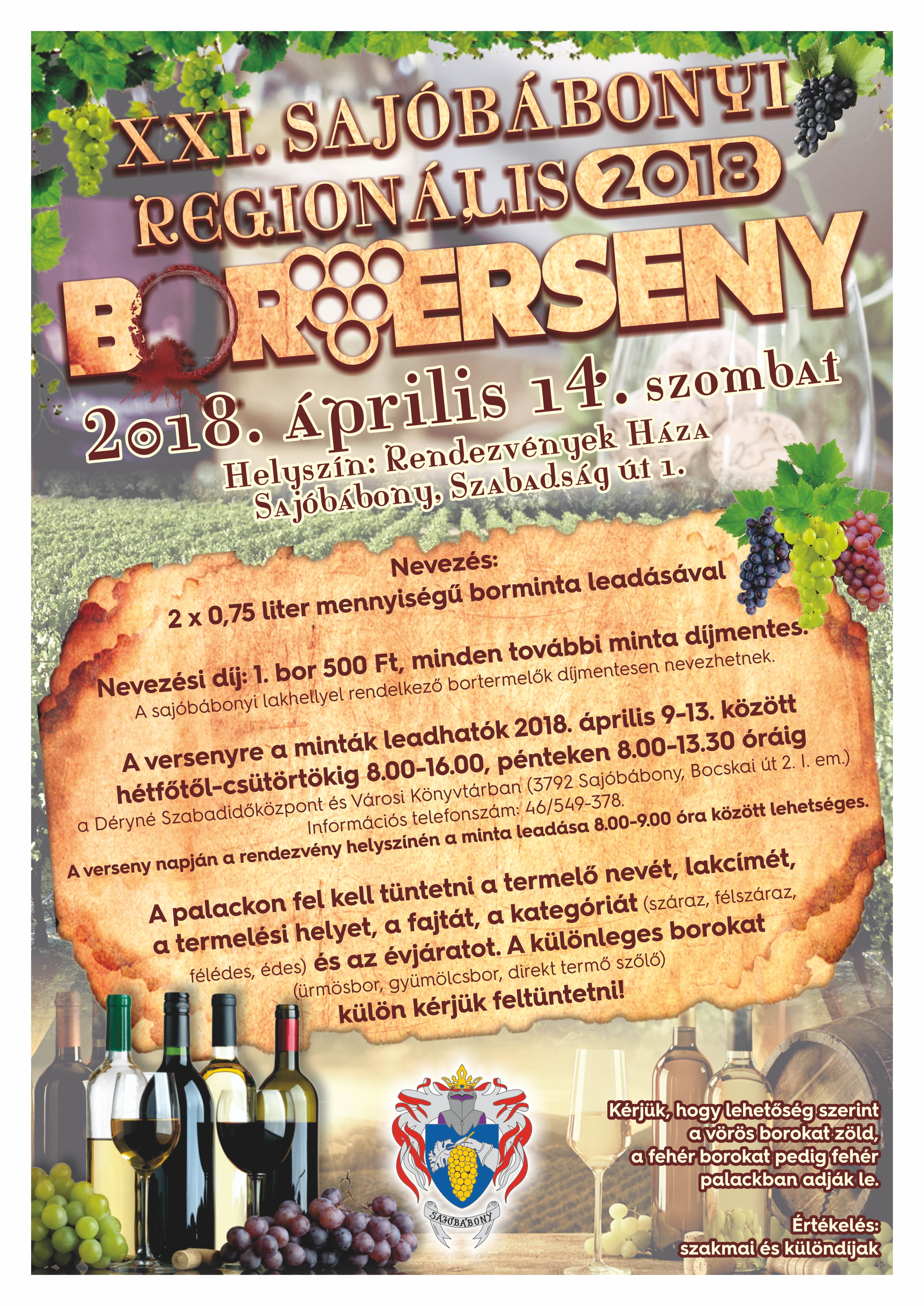 A Déryné Szabadidőközpont és Városi Könyvtár 2018.04.14-én a hagyományaihoz híven Borversenyt szervez, melyre minden érdeklődőt, nevezni vágyót tisztelettel vár! Bővebb információ az alábbi plakáton, illetve a rendezvénnyel kapcsolatosan érdeklődni lehet személyesen a Déryné Szabadidőközpontban (Sajóbábony, Bocskai út 2.) és a 06-46/549-378 telefonszámon