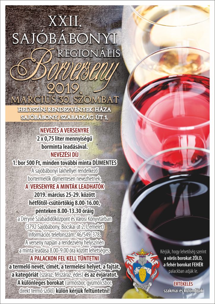 A Déryné Szabadidőközpont és Városi Könyvtár 2019.03.30-án a hagyományaihoz híven Borversenyt szervez, melyre minden érdeklődőt, nevezni vágyót tisztelettel vár! Bővebb információ az alábbi plakáton, illetve a rendezvénnyel kapcsolatosan érdeklődni lehet személyesen a Déryné Szabadidőközpontban (Sajóbábony, Bocskai út 2.) és a 06-46/549-378 telefonszámon.